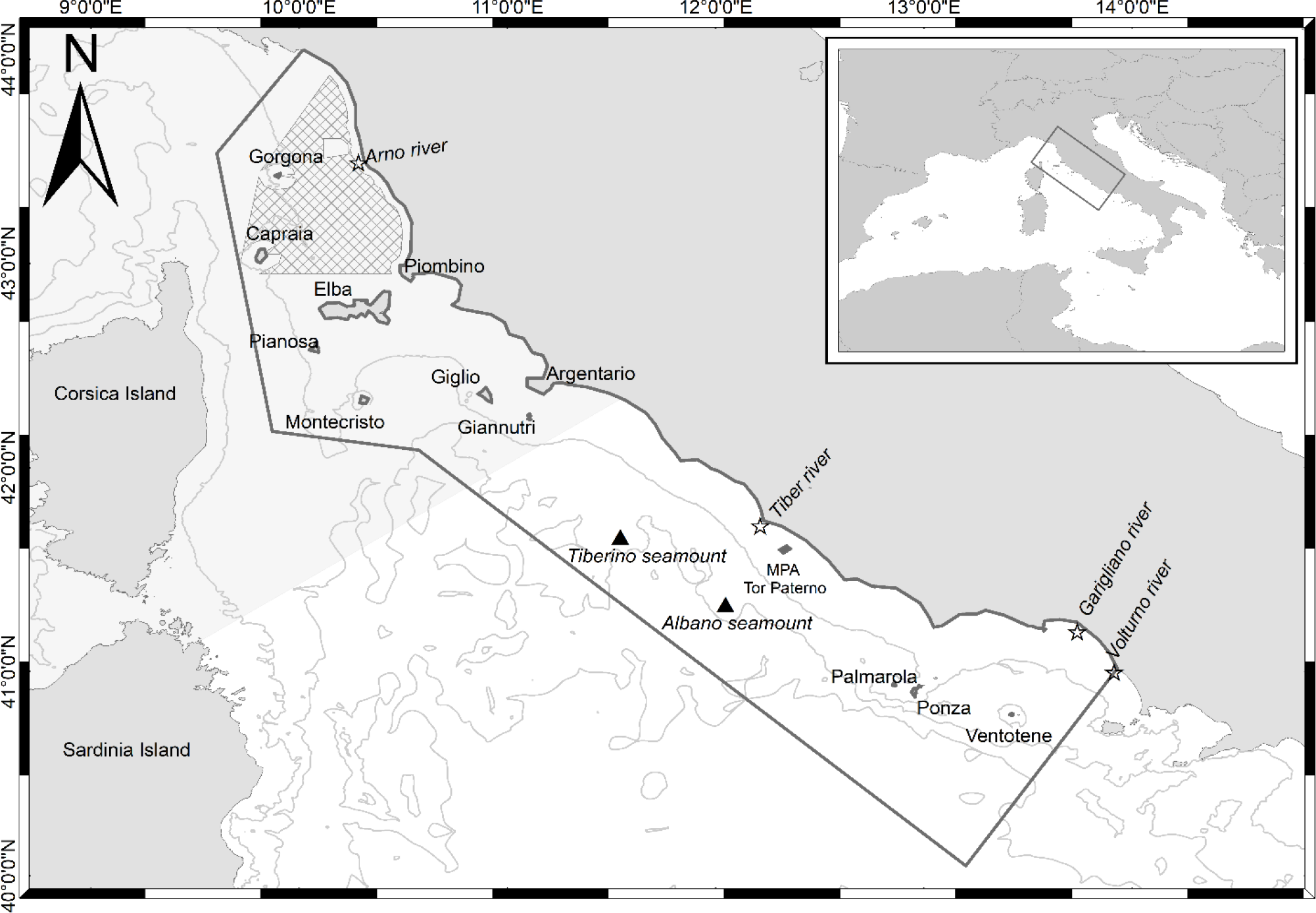 Many seamounts are included or border the entire study area, such as the Santa Lucia and Occhiali seamounts in the north, the Cialdi, Etruschi, and Tiberino in the middle, and the Albano seamount in the south (Würtz and Rovere, 2015). Seamounts attract a rich associated fauna and strongly influence the distribution of pelagic top predators, which can find optimal foraging areas around them (Würtz and Rovere, 2015; Bo et al., 2020). The several river mouths present in the area affect the coastal marine ecosystems as they are major sources of organic matter for the adjacent marine waters. They include the Arno river (in the northern part of the study area), the Tiber river (in the middle of the study area), and the Garigliano and Volturno rivers (in the southern part of the study area).