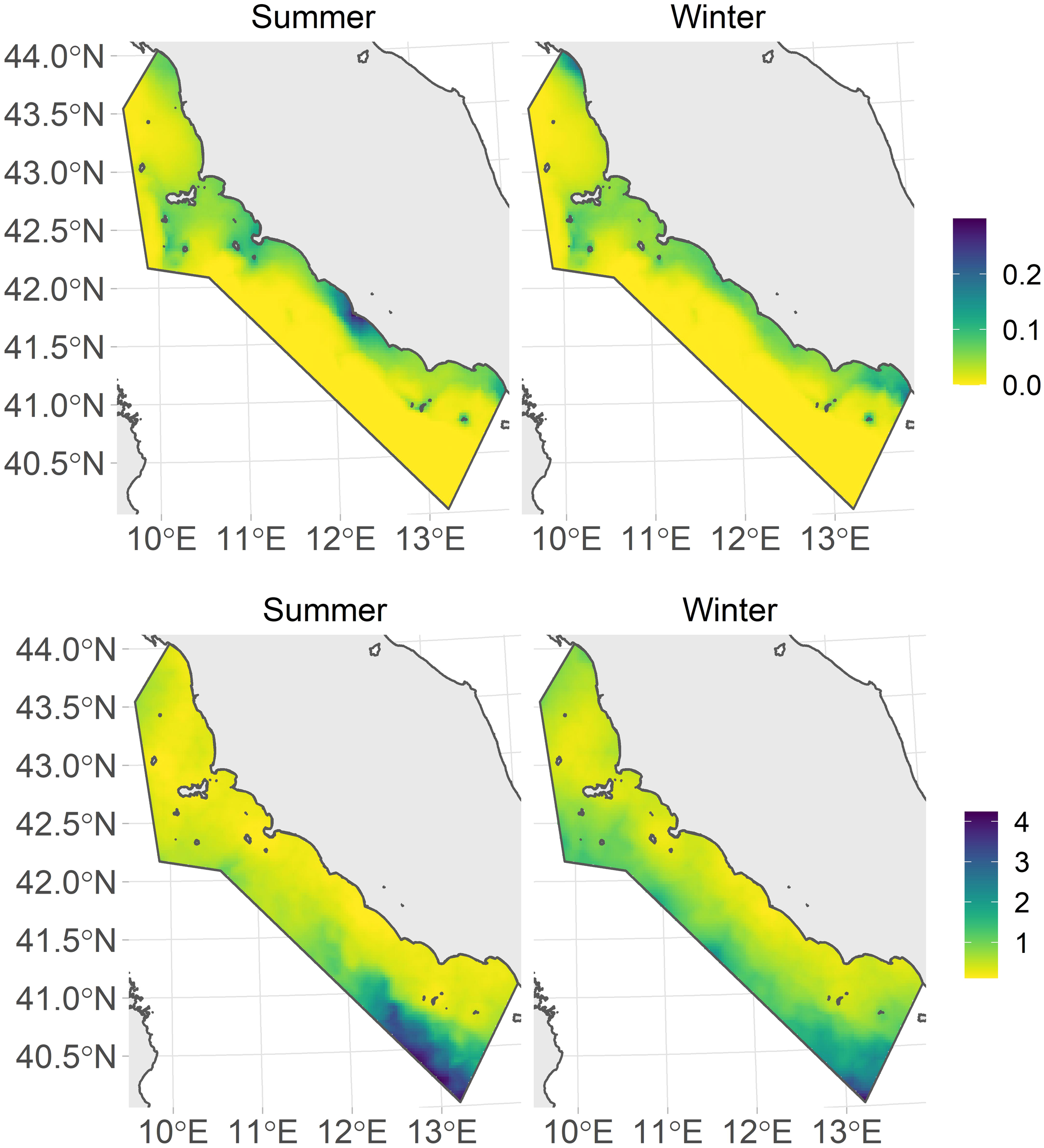 The estimated posterior mean and coefficient of variation (CV) surfaces for the intensity of the common bottlenose dolphin distribution by season are reported in Figure 6. In summer, the Tiber River estuary (nearly in the middle of the study area) showed higher intensity than other coastal regions. In winter, almost homogeneous predictions were observed, with marginal greater intensities at the two extremes of the study area (the Arno estuary in the northern part and Gaeta Gulf in the south), where lower temperatures and slightly higher chlorophyll–a concentration were observed. The relatively low variance was predicted in the more coastal parts of the study area within each season, while higher uncertainty was instead revealed in the southernmost offshore area.