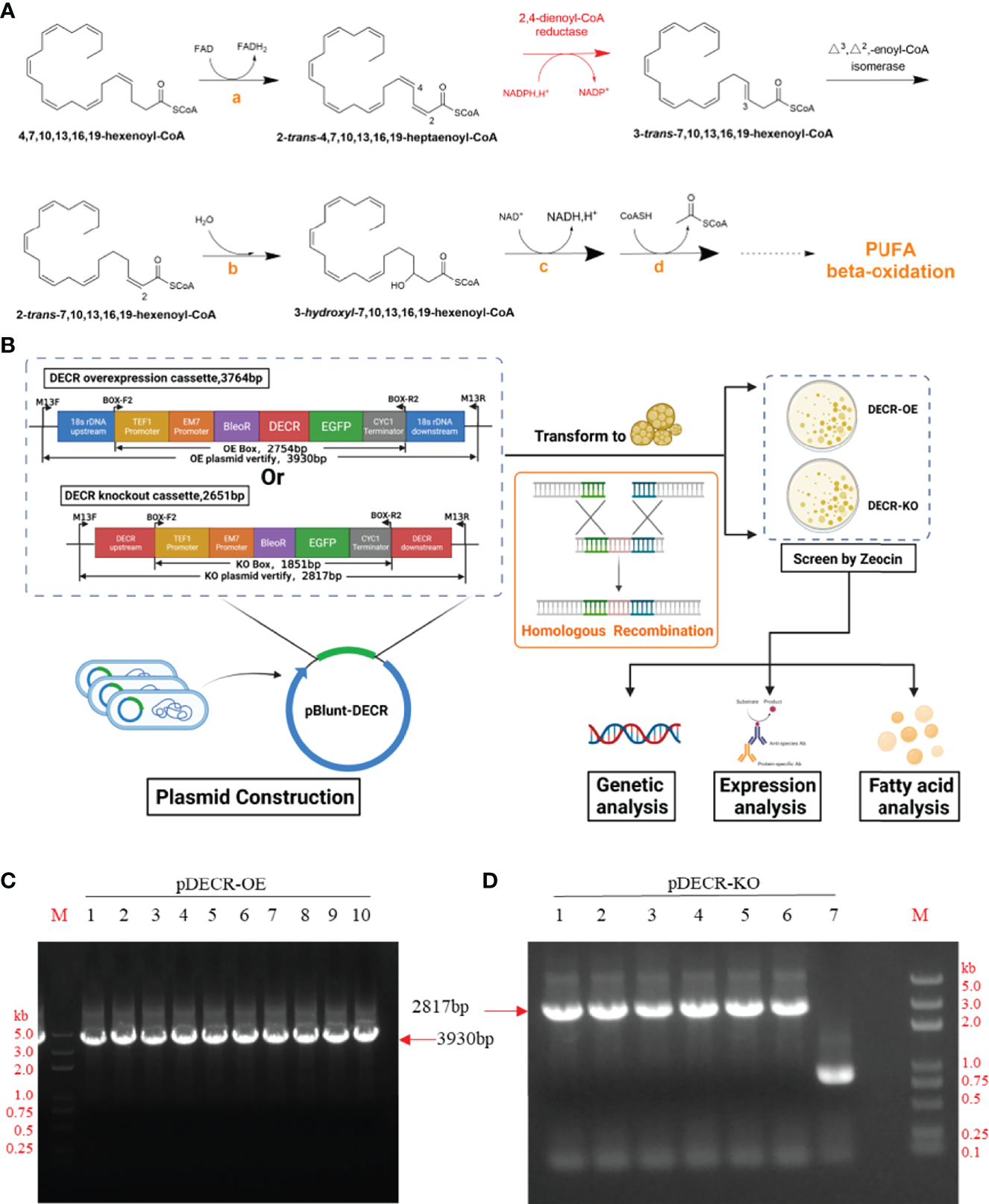 Pathway, approach, and plasmid identification. (A) The pathway of DHA beta-oxidation. The orange letters indicate enzymes involved in standard beta-oxidation: acetyl-CoA dehydrogenase (a), enoyl-CoA hydratase (b), hydroxyacyl-CoA dehydrogenase (c), and beta-ketothiolase (d), respectively. Created with Chemdraw 20.0. (B) Approach to study the effect of DECR on fatty acids. The upstream and downstream homology arms of the overexpression (OE) cassette contain 18s rDNA, those of the knockout (KO) cassette contain DECR. After transformation, the transformants of DECR-OE and DECR-KO were screened with Zeocin and analyzed. Created with BioRender.com. (C) and (D) Identification of the pBlunt plasmid containing DECR overexpression (OE) and knockout (KO) cassettes in E. coli with the primer pair M13F/M13R by PCR, respectively. (C) The 3930 bp band indicates the amplification of the DECR overexpression cassette. Numbers 1 to 10 represent the colony numbers of the OE plasmids in E.coli.(D) The 2817 bp band indicates the amplification of the DECR knockout cassette. Numbers 1 to 7 represent the colony numbers of the corresponding plasmids in E.coli. M, DL5000 DNA Marker.