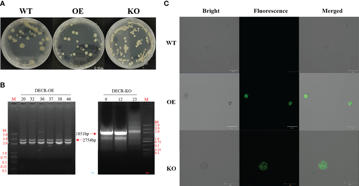 Obtaining and identifying the transformants. (A) Screening transformants through Zeomycin resistance (0.3 mg mL−1). Yellow clones were visible after 24–48 h, and transformants were kept in an M4 plate containing 0.3 mg mL−1 Zeomycin. Left, wildtype (WT) grown on an M4 solid plate. Centre and right, DECR overexpression (OE) and knockout (KO) mutants grown on M4 plates containing 0.3 mg mL−1 bleomycin, respectively. (B) PCR verification of transgenic Aurantiochytrium sp. SZU445 with OE-overlap and KO-overlap. Specific fragments of 2754 bp and 1851 bp were amplified from the genome of OE and KO transformants, respectively; 20, 32, 36, 37, 38, and 46 are the transformants with the OE cassette, and 9, 12, 23 are the transformants with the KO cassette. M, DL 5000 DNA Marker. (C) Confocal microscope observations of the green fluorescence produced by EGFP expression in OE and KO mutants. WT has no autofluorescence. Scale bar: 20 μm.