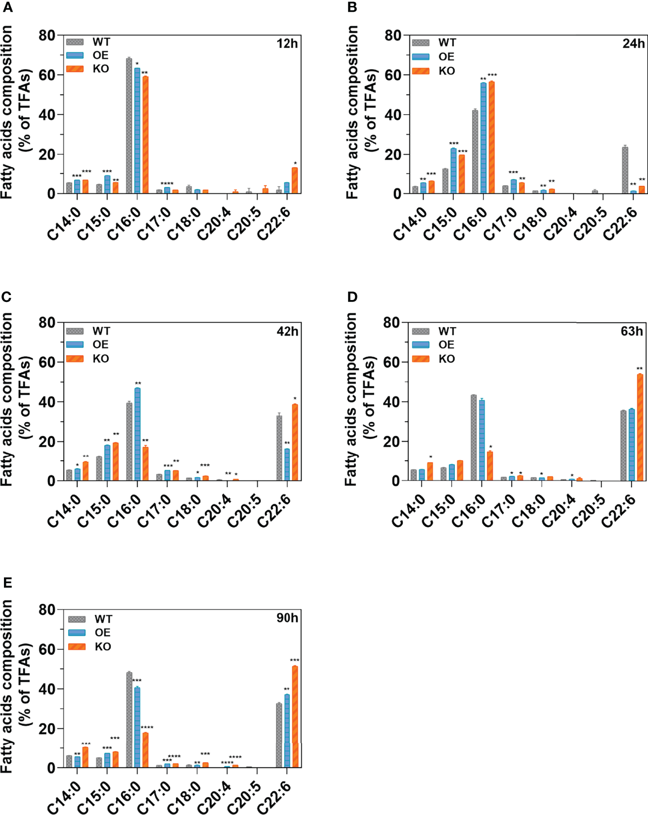 Fatty acid composition in various growth stages. (A–E) indicate the fatty acid composition of the wildtype (WT) strain, DECR overexpression (OE), DECR and knockout (KO) transformants detected by GC-MS after 12 h, 24 h, 42 h, 63 h, and 90 h, respectively. Data are shown as the percentage of total fatty acids (TFAs). C14:0, tetradecanoic acid; C15:0, pentadecanoic acid; C16:0, hexadecanoic acid; C17:0, heptadecanoic acid; C18:0, octadecanoic acid; C20:4, eicosatetraenoic acid; C20:5 eicosapentaenoic acid; C22:6, docosahexaenoic acid. Significant difference between wildtype strain (WT) and transformants (OE and KO) indicated at the p < 0.05 (*), p < 0.01 (**), p < 0.001 (***), or p < 0.0001 (****) level. All data are expressed as the mean ± S.D. of three independent experiments.