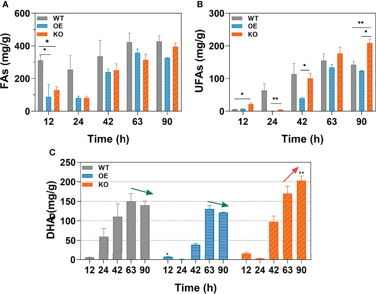 The yield of different types of fatty acids. (A-C) are the contents of total fatty acids (TFAs), unsaturated fatty acids (UFAs), and docosahexaenoic acid (DHA) respectively. Data shown are the weight of fatty acids per gram dry cells weight (DCW). Arrows (green and red) indicate the trend in DHA yield from 63 h to 90 h. Statistically significant differences between wildtype and transformants (OE and KO) were indicated at the p < 0.05 (*) and p < 0.01 (**) level. Values are the mean ± standard deviation.