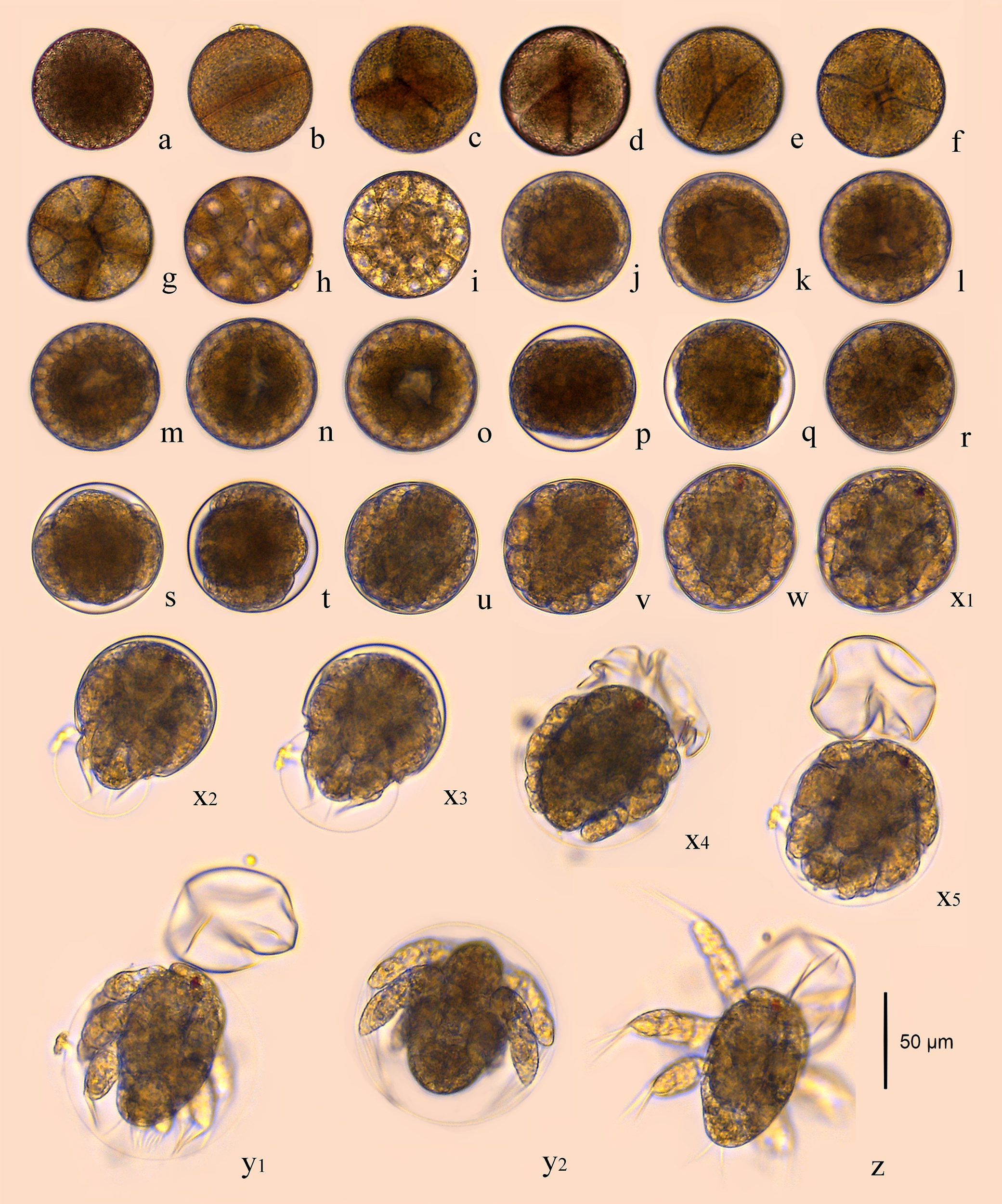 Embryonic development of B. amoyensis. (A), fertilized eggs; (B), 2-cell stage; (C–E), 4-cell stage; (F), 8-cell stage; (G), 16-cell stage; (H–I), multicellular phase; (J–O), grastrula stage; (P–Q), no structure visible; (R–T), limb bud stage; (U–W), the early stage of nauplii; (X1–X5), the rupture stage of outer membrane; (Y1–Y2), the rupture stage of inner membrane; (Z), the first stage of nauplii.