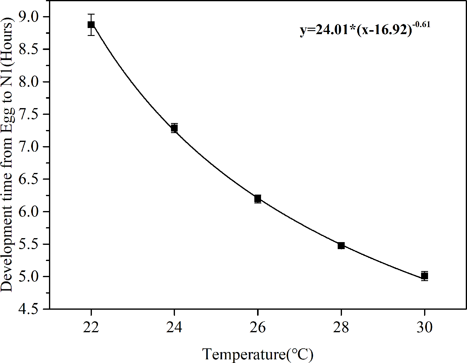 Correlation curves between egg development time (D) and water temperature (T) in B. amoyensis (N=30). Data are presented as mean± standard error (SE).