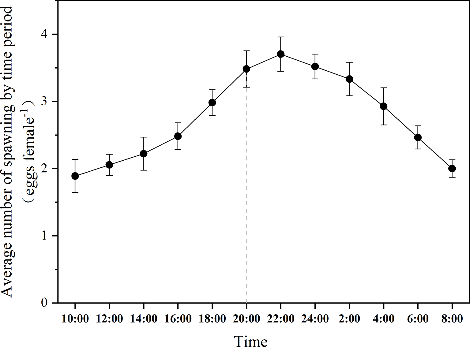 The daily spawning rhythm of B. amoyensis. Data are presented as mean± standard error (SE). The dotted line is the point in time when the dark period is entered.