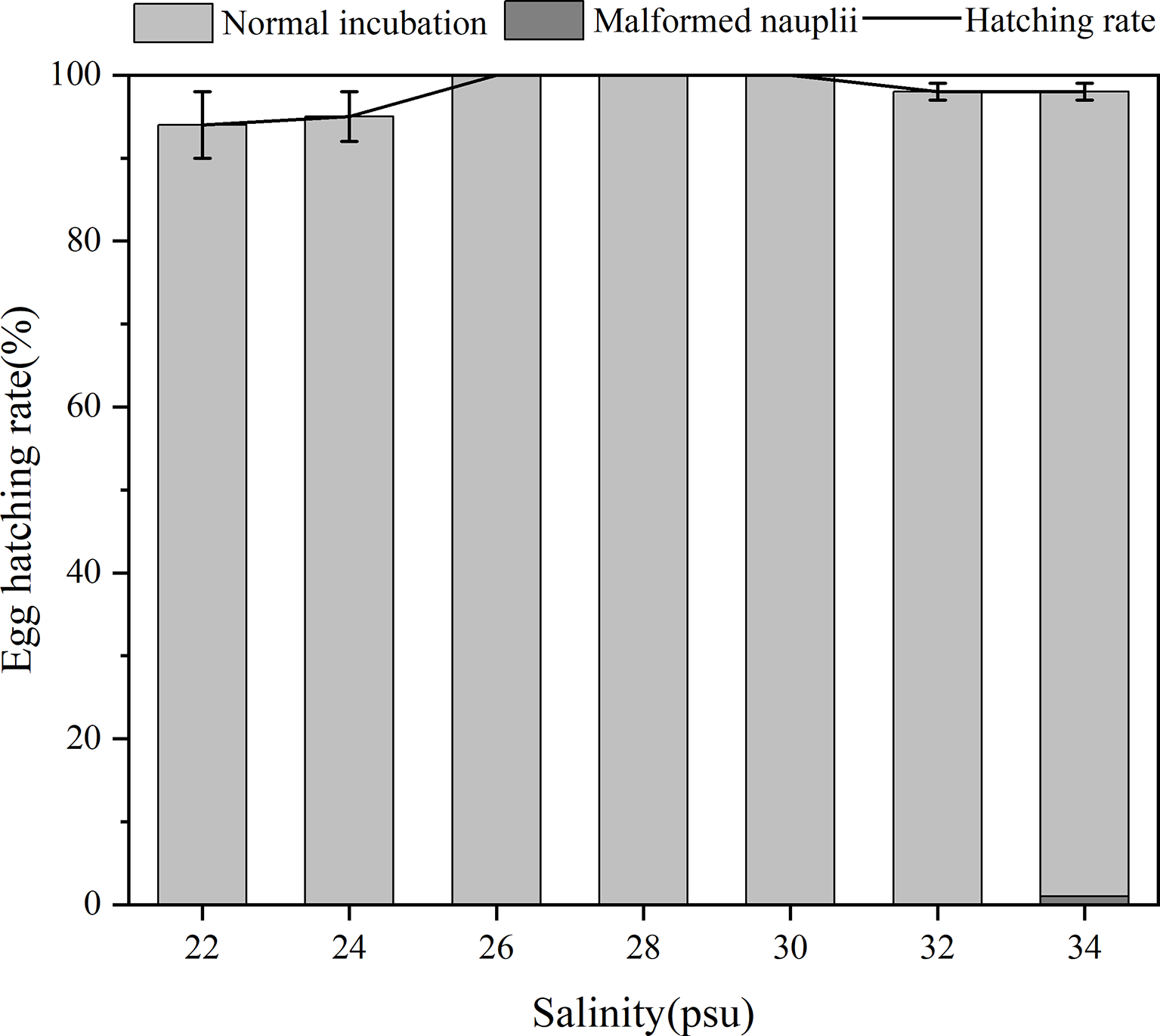Hatching success was not significantly different among the six salinity treatments (p > 0.05, one-way ANOVA), which were all above 88% and the hatching success reached 100% at 26–30 psu salinity treatments (Figure 6). Although a few malformed nauplii were hatched at salinity of 34 psu, the hatching rate from that salinity was still high and that of all replicates was above 96%. These results indicated that B. amoyensis eggs could hatch well within a salinity range of 22–34 psu.