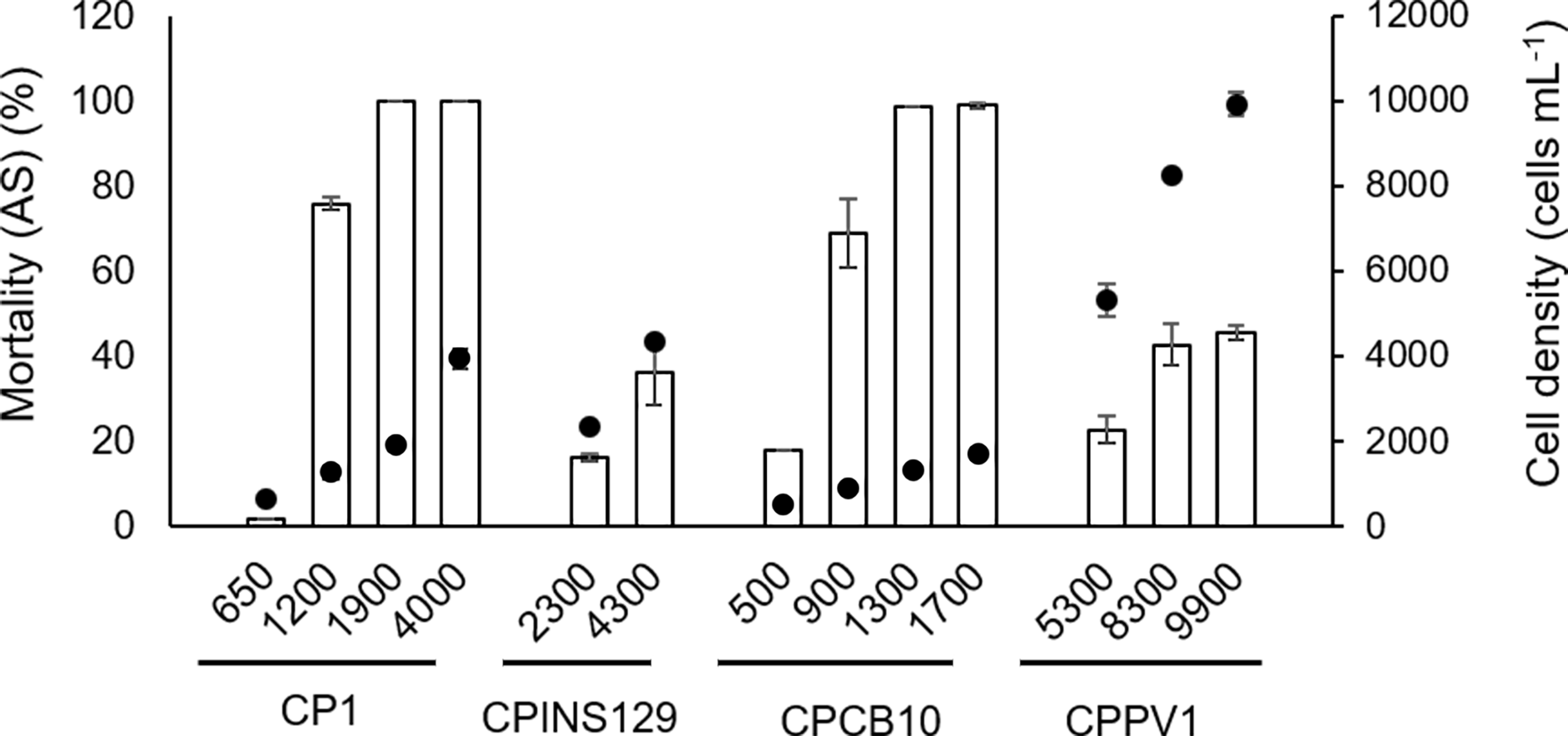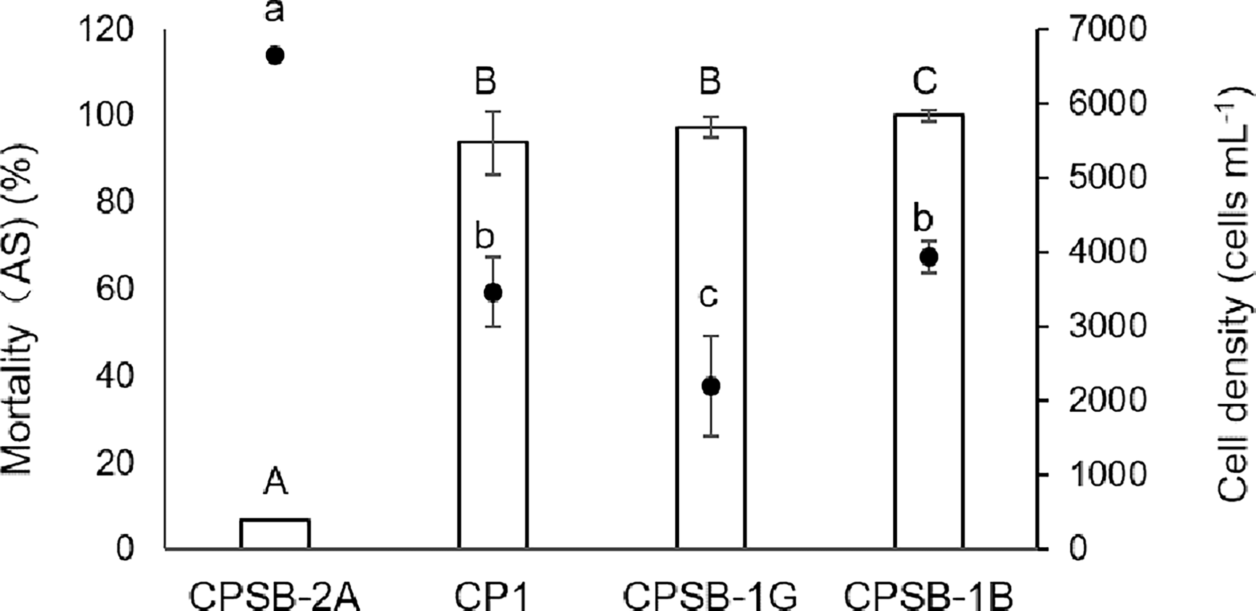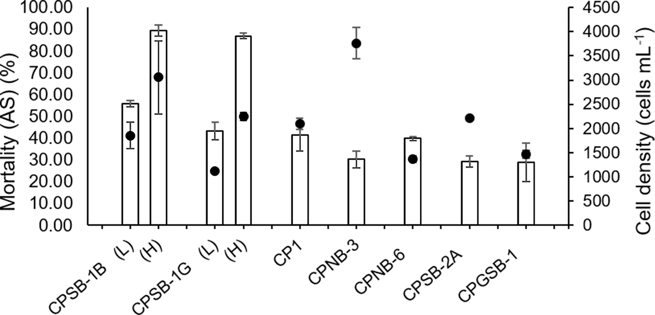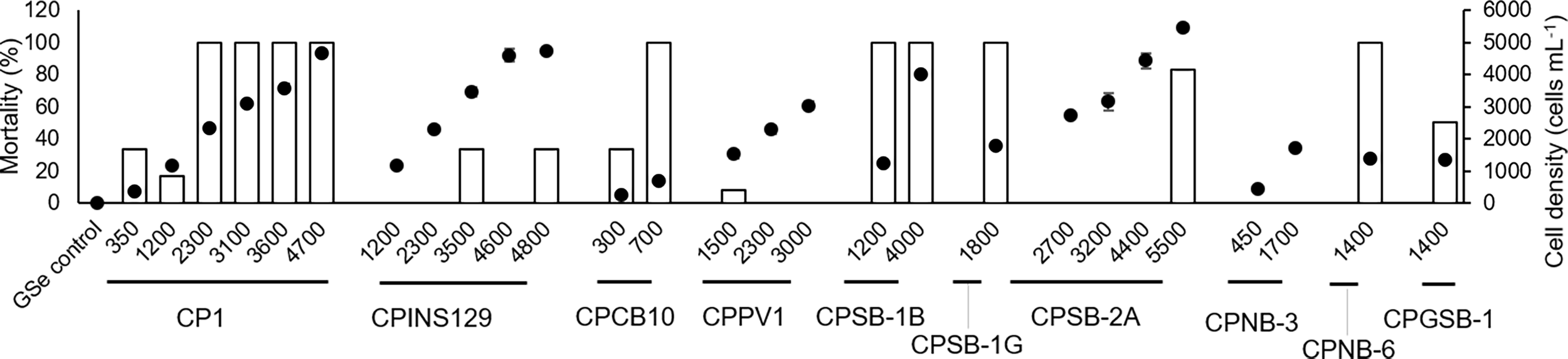 Toxic effects of M. polykrikoides on sheepshead minnows Cyprinodon variegatus in 24 h expressed as mortality (%) of sheepshead minnows (bars). The corresponding cell density of different strains of M. polykrikoides was also shown as dots for comparison. Error bars indicate ±1 SD of n = 6.