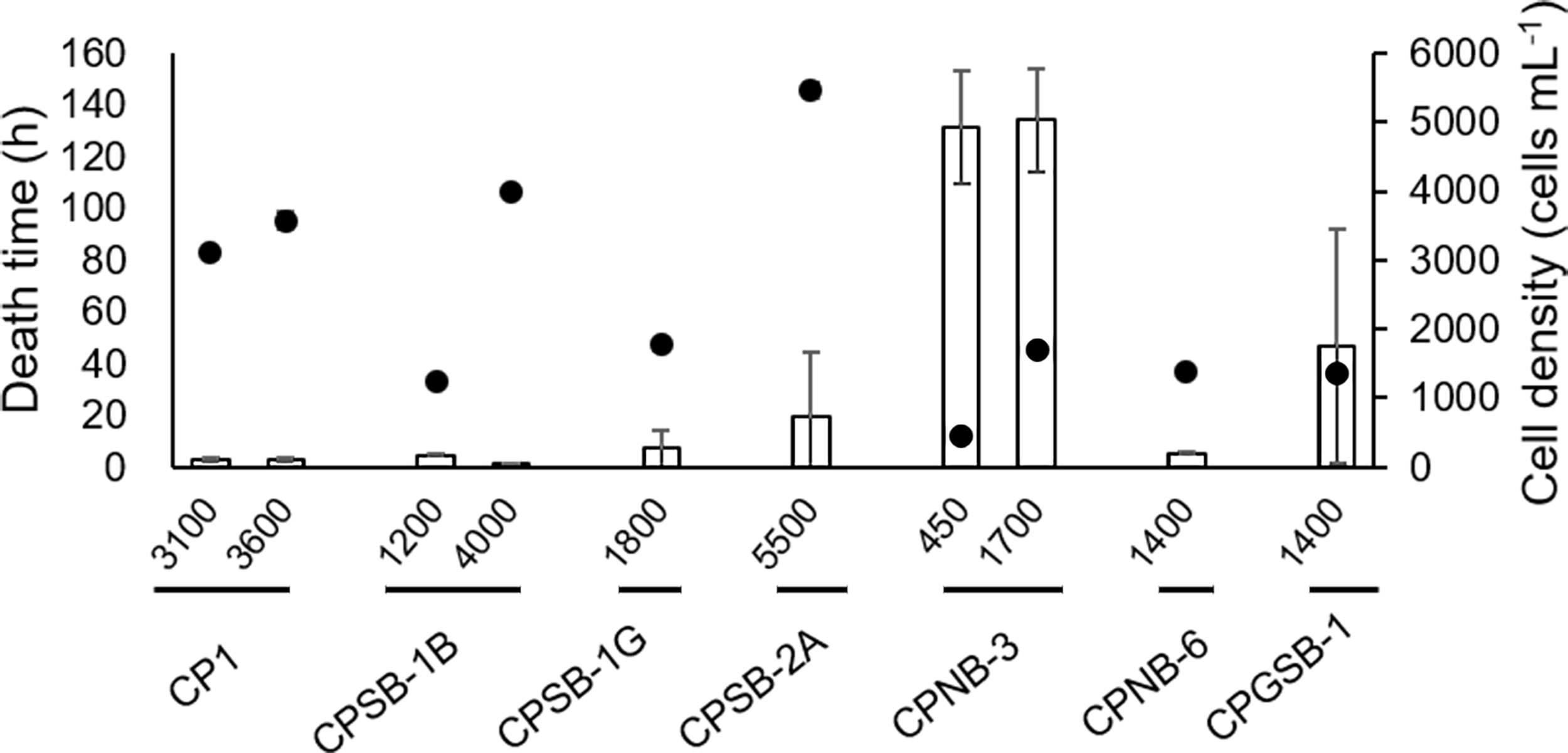 Toxic effects of M. polykrikoides on sheepshead minnows Cyprinodon variegatus expressed as death time. The dots represent the cell density of different strains of M. polykrikoides. Error bars indicate ±1 SD of n = 6.