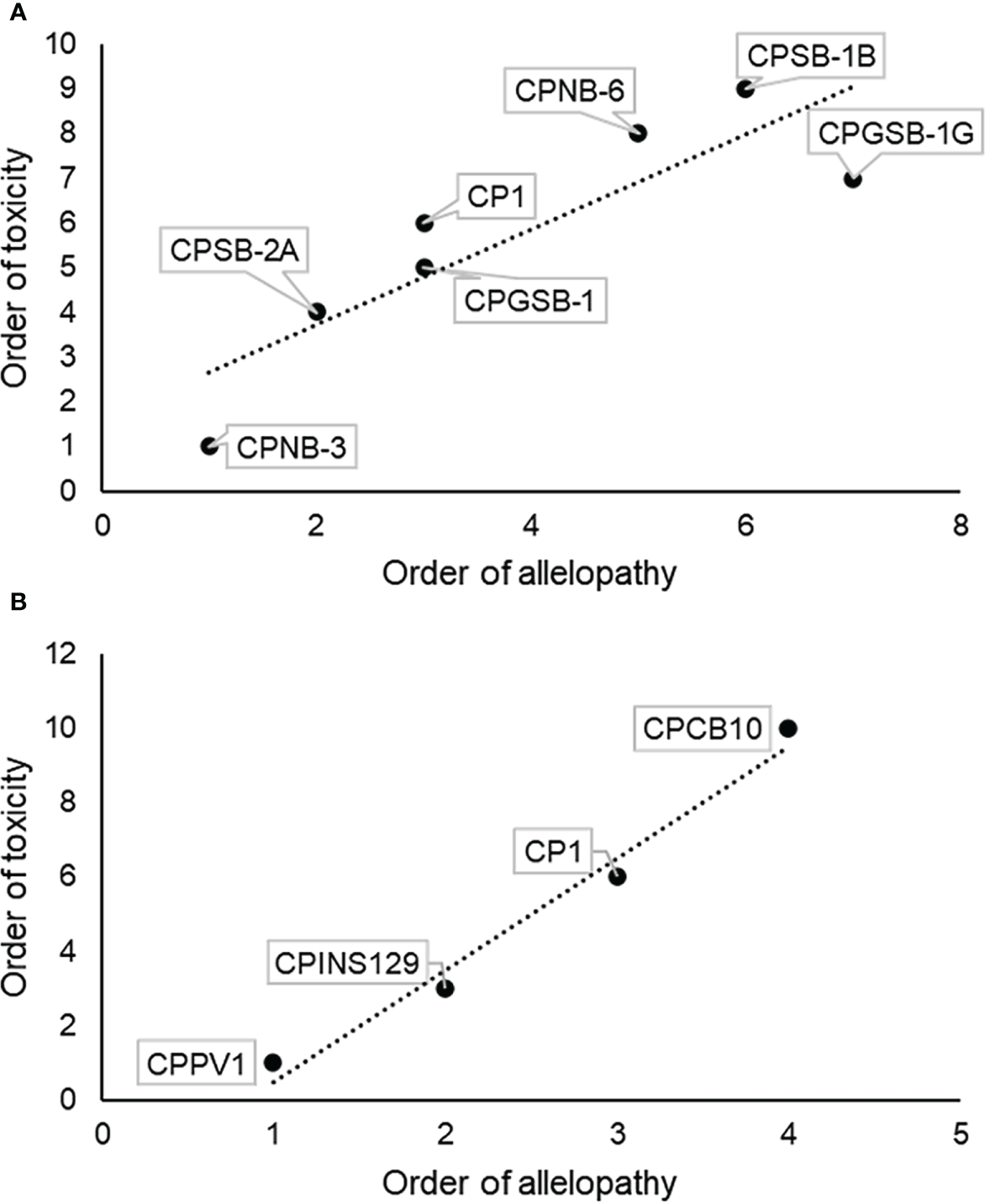 Correlation analysis of allelopathic intensity and toxic intensity of different strains of M. polykrikoides. (A) Order of allelopathic effects of M. polykrikoides on ASNP-6 and toxic effects of M. polykrikoides on sheepshead minnows. (B) Order of allelopathic effects of M. polykrikoides on AS2 and toxic effects of M. polykrikoides on sheepshead minnows.
