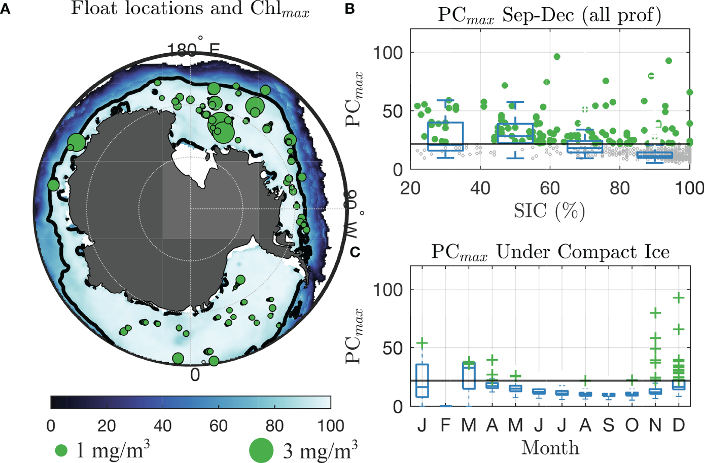 Phytoplankton biomass under compact ice increases with increasing solar irradiance. Box plots of PCmax in each month are given in Figure 1C for all under-compact-ice profiles, and we see most “UIB” profiles occurring in November and December. Median PCmax under compact ice ranged from 10.17 mg/m3 (n = 275) in August to a high of 16.4 mg/m3in December (n = 80). The number of UIB profiles was just 1 of 1,269 (0.1%) of profiles measured from June to September, 1 out of 267 (0.4%) of profiles in October, 11 out of 197 (5.6%) of profiles in November, and 18 out of 81 (22.2%) of profiles in December–February. Thus, of all segmented profiles, we find a total of 31 that attained values we deem representative of a UIB in spring–summer. Those profiles had an average PCmax of 35.6 mg/m3 and an average Chlmax of 1.13 mg/m3. We find seven profiles meeting the UIB thresholds in late fall (March–May), which we term “freezeover” profiles, as they are the first under-compact-ice profiles taken by these floats in a given year. They likely derive from sea ice freezing over an existing region of elevated biomass. These seven profiles have a mean Chlmax of 0.39 and a mean PCmax of 27.0, lower than the late spring under-ice valueswe determine to be UIBs.
