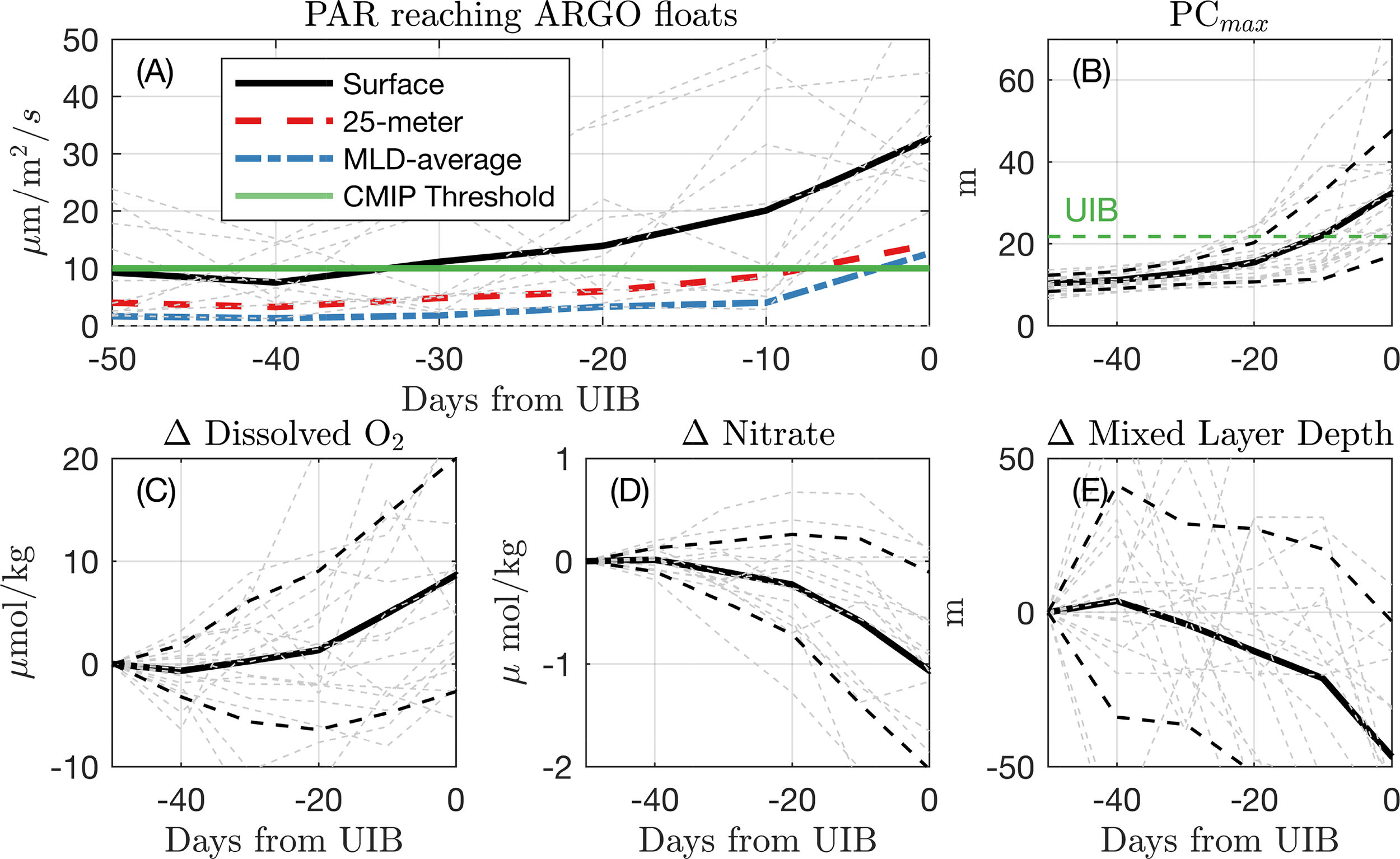 Under-ice conditions preceding UIBs. (A) Averaged estimated PAR for each of the 12 measured “UIBs” for the first profile identified as a UIB and the five preceding under-ice profiles. The black line is the average surface PAR. The red dash line is the average PAR over top 25 m. The blue dot–dash line is PAR averaged over Argo-measured mixed layer depth. The green line indicates the PAR threshold used to define UIBs in CMIP6 data. (B) (C) Change in dissolved oxygen at depth of Chl$_{max}$, relative to the value recorded 50 days (5 dives) preceding the first UIB measurement. (D–E), same as (C) for (D) nitrate at depth of Chl$_{max}$, and (E) mixed layer depth. Dashed lines indicate standard deviation of profile measurements.