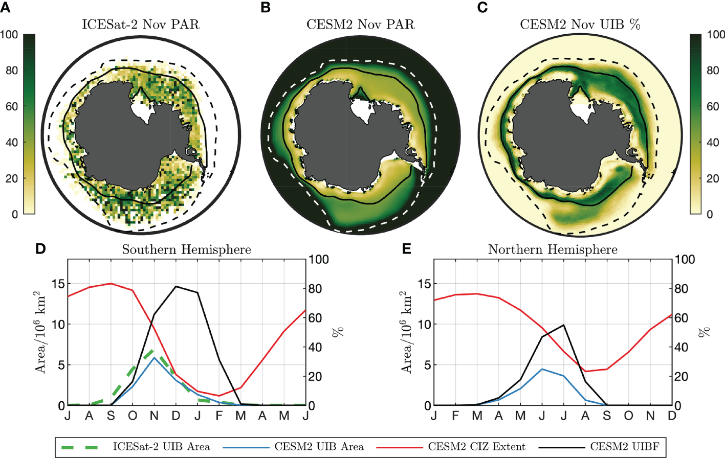 Light field and UIB potential under Southern Ocean sea ice (A) 2018–2020 November surface PAR (μmol photons/m2/s) estimate from ICESat-2. (B) CESM2 climatological PAR from preindustrial simulation. Solid lines in (A, B) are CESM2 climatological CIZ (concentration above 80%). Dashed lines are climatological SIE (concentration above 15%). (C) CESM2 November UIB%. (D, left axis) Seasonal cycle of CESM2 (red) CIZ extent and (blue) UIB extent. The dashed green line is the UIB area from ICESat-2. (D, right axis) CESM2 UIBF. (E) As in (D), but for the Northern Hemisphere. Axes in (D) and (E) are offset by 6 months.