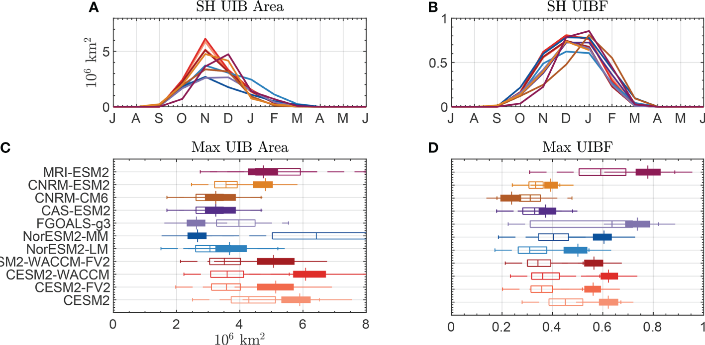 In Figures 4A, B, we plot the climatological seasonal cycle of Southern Ocean UIB area (A) and UIBF (B) for the 11 CMIP6 models (listed in Supporting Table S3). Across these models, we found a similar seasonal cycle. None of the CMIP6 models show large UIB areas before October, but 10 of 11 reach a maximum UIB area in November. Only the MRI-ESM2 model shows a maximum UIB area in December. Each model has a climatological UIB area exceeding 2.66 million km2, with a median of 4.75 million km2. In Figure 4C, we show box plots of the annual maximum UIB area in the Antarctic for each of the models (filled), compared with the annual maximum UIB area in the Arctic (unfilled) for the same years. Out of 11 models, eight have median Antarctic UIB areas that exceed Arctic UIB areas.