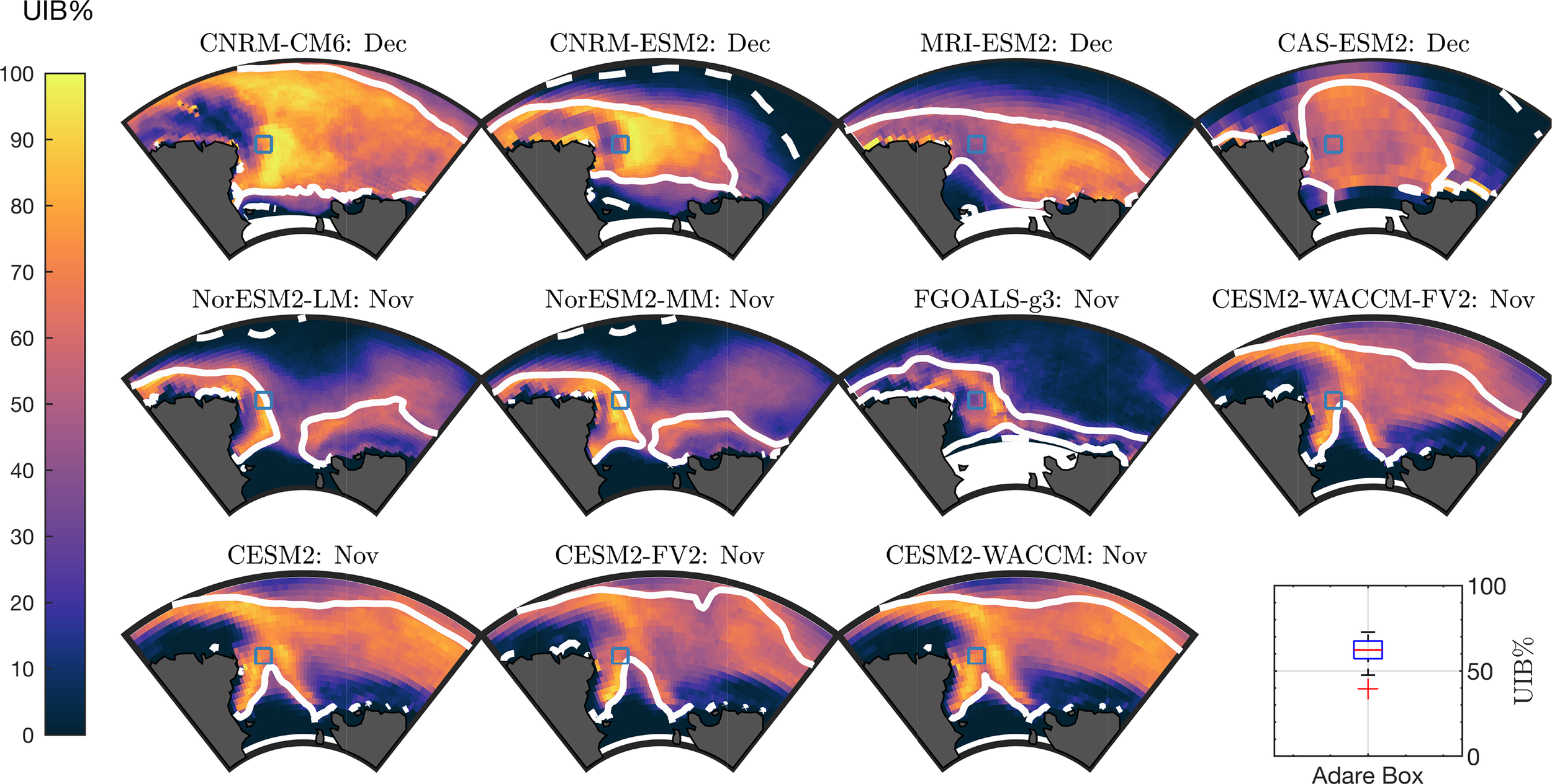 In Figure 5, we plot UIB% for each of the 11 models during the model period with highest Ross Sea UIB area, which is November in seven models and December in four models. All models have high UIB% in the coastal region near Cape Adare in the Western Ross Sea, which has compact sea ice into January. We marked this region at 72 ∘ S, 178.5 ∘ E with a blue square in Figure 5. A box plot of UIB% in this location is given for these 11 models in Figure 5 (bottom right), showing a median UIB% of 62% with a minimum of 40%. Across the CMIP6 models, a mean area of 0.55 million km2 of the Ross Sea is expected to permit UIBs, although the borders of UIB-permitting areas vary by model and range from 0.29 million km2 (MRI-ESM2, 49% of the Ross CIZ) to 0.95 million km2 (NorESM2-LM, 65% of the Ross CIZ), including interannual variability. Independent of modeled sea-ice area coverage, a large fraction of the Ross CIZ permits UIBs in each year in all models. Figure 4 is repeated as Supporting Figure S5 for the Ross Sea region, showing that during the month of highest Ross Sea UIB area, at least 49% of the Ross CIZ permits UIBs in each model, with an average of 60%.