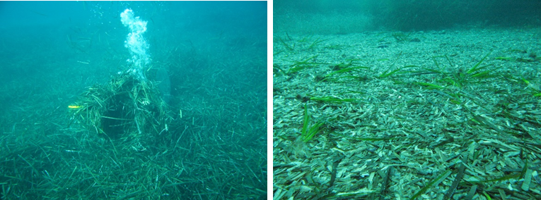 Subtidal accumulation of Posidonia oceanica macro detritus. Left: November 2010, recently exported dead leaves (80 cm thick), 10 m depth, Revellata Bay, Calvi, Mediterranean Sea. Right: June 2012, fragmented macrophytodetritus with uprooted living P. oceanica shoots, 10 m depth, Revellata Bay, Calvi Corsica.
