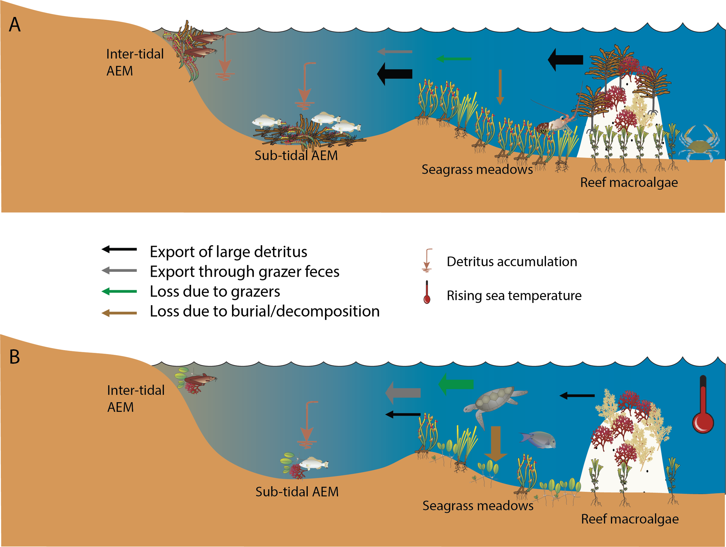 Tropicalization of seagrass ecosystems is predicted to influence the supply of seagrass detritus to other ecosystems through a number of processes: (1) increases in tropical grazers will lead to greater consumption of seagrass biomass and reduced release of leaves for internal processing or export; (2) increases in microbial and invertebrate processing with increasing temperatures and invasive invertebrates will lead to less export due to increased internal cycling and a change in the quality of litter being exported; (3) shifts in seagrass species to tropical species will lead to less export of detritus; and/or (4) seagrass meadows exhibiting a shift from seagrass to macroalgae will shift the quality of the material in AEM. Most of these potential changes will affect AEM as habitat for associated fauna and AEM trophic functioning. It must be noted that these processes are not mutually exclusive, and are likely to have a compounding influence on the amount of seagrass detritus being exported from seagrass systems.