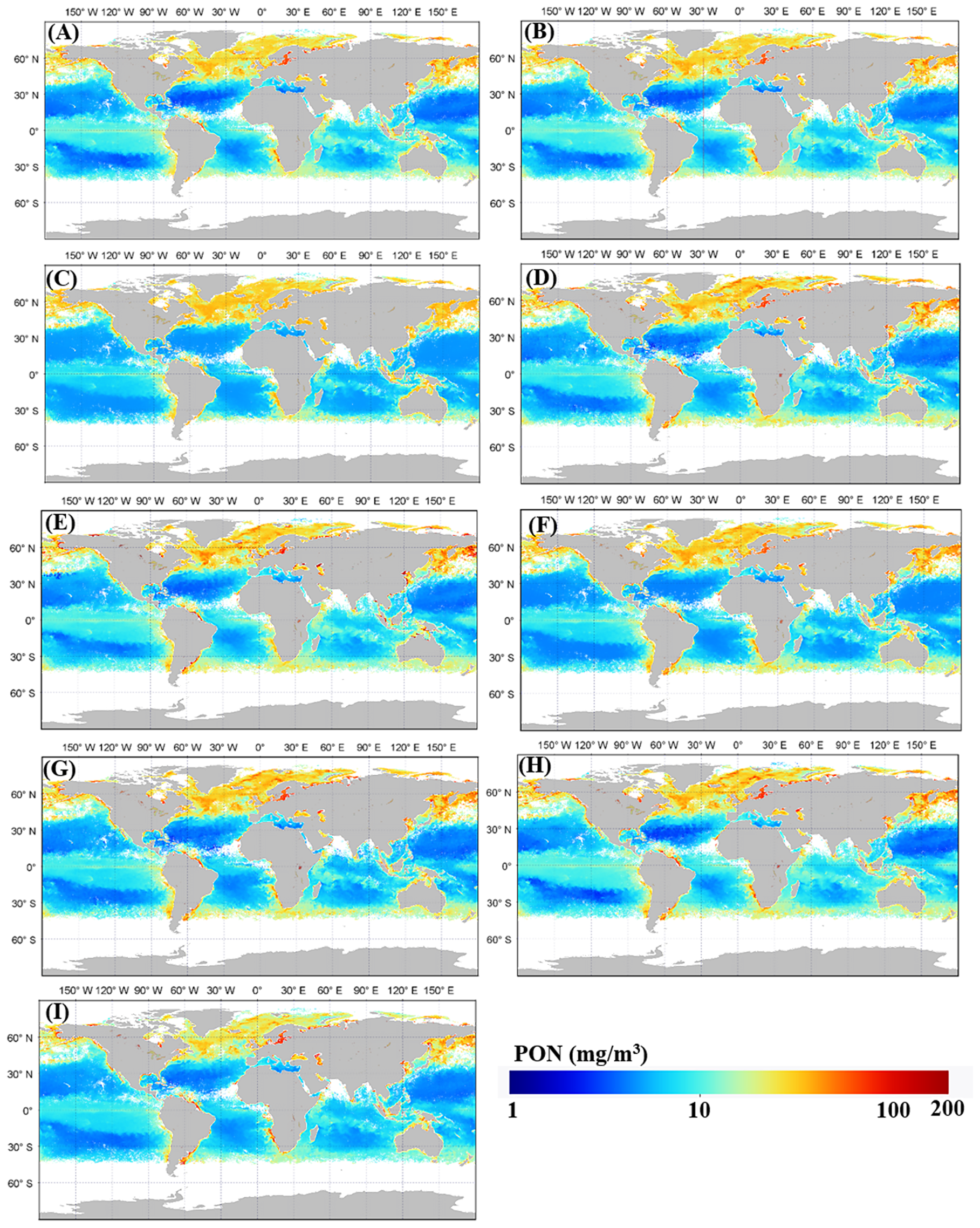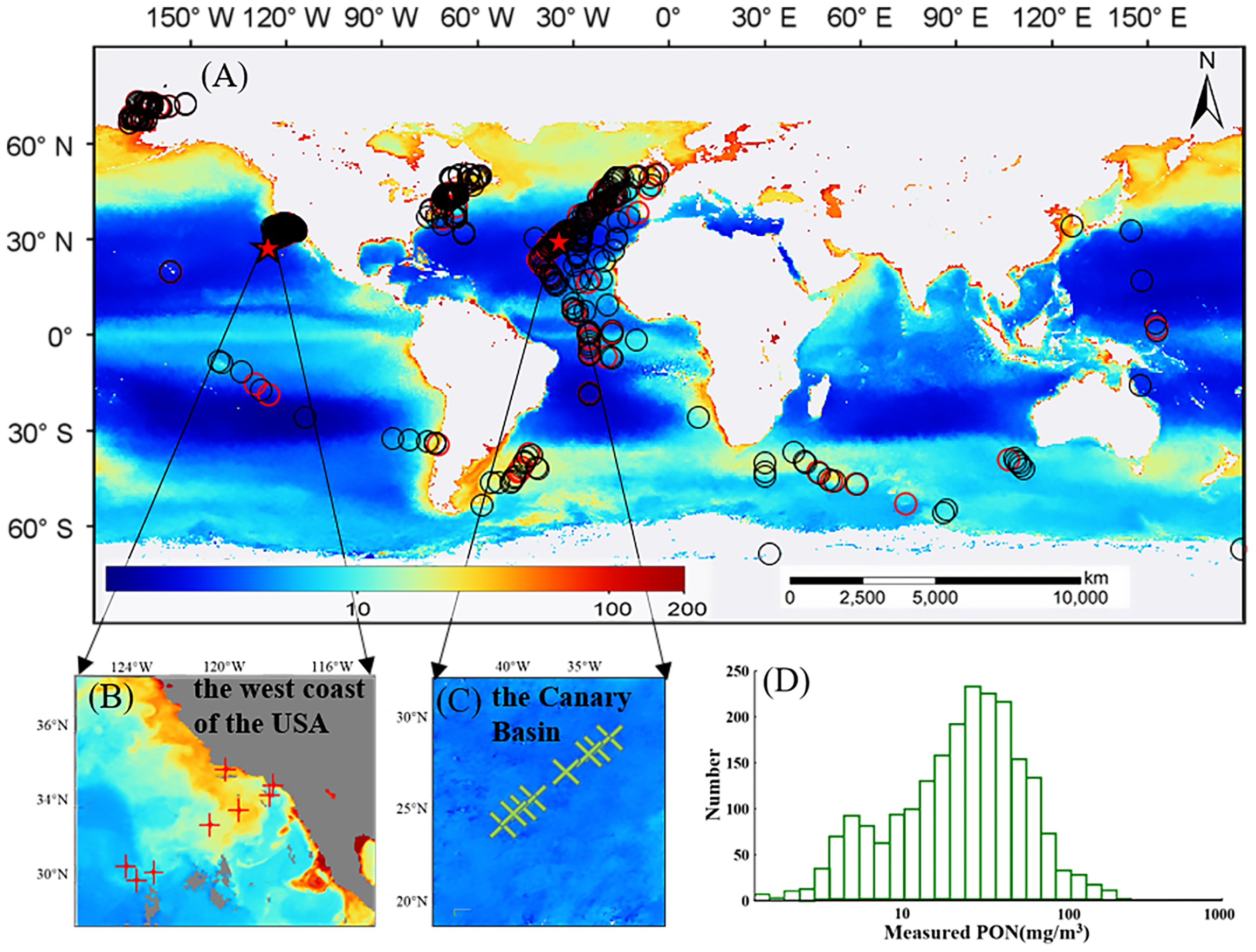 Particulate organic nitrogen (PON) refers to the nitrogen contained in biological or other debris particles (Smith et al., 1986). In addition, the PON concentration has distinct spatiotemporal variations over the global ocean because of biological production, PON transformations, physical mixing, and horizontal transport by ocean currents (Wada and Hattori, 1990; Wang et al., 2008; Pajares and Ramos, 2019). Traditionally, oceanic PON concentrations were obtained through in situ sampling and laboratory determination (Holm-Hansen, 1968), and the spatiotemporal PON variations in the large area were simulated with physico-biogeochemical models (Deutsch et al., 2007; Wang W. L. et al., 2019). However, the model performance depends on its consistence with the real world, which might be undermined because of lacking enough input in situ PON data.