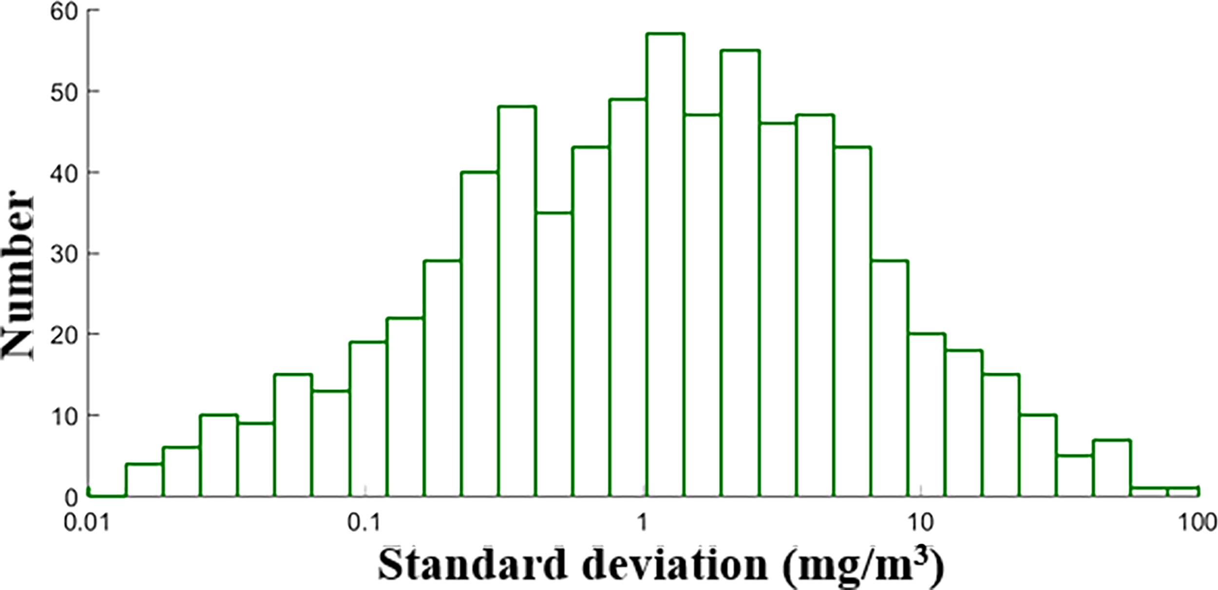 The histogram of standard deviation of in situ PON concentrations within the top 10 meters, and the scale of x-axis is in log10 transformation.