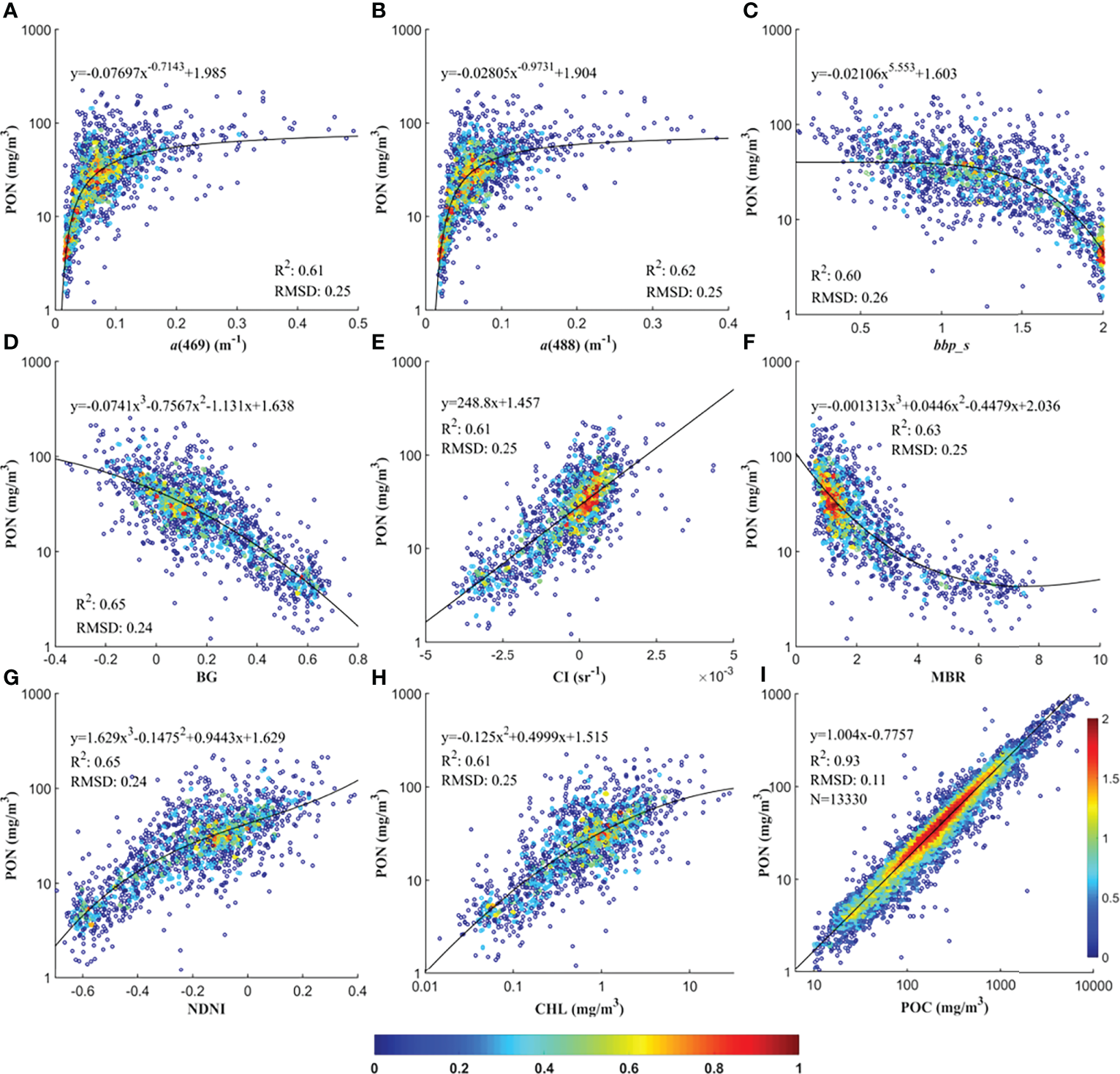 Oceanic PON concentrations retrieval models based on a(469) (A), a(488) (B), bbp_s (C), BG (D), CI (E), MBR (F), NDNI (G), CHL (H), and POC (I), respectively. PON, CHL and POC are in log10 transformation. The numbers along the ramp indicate the pixel density after log10 transformation.