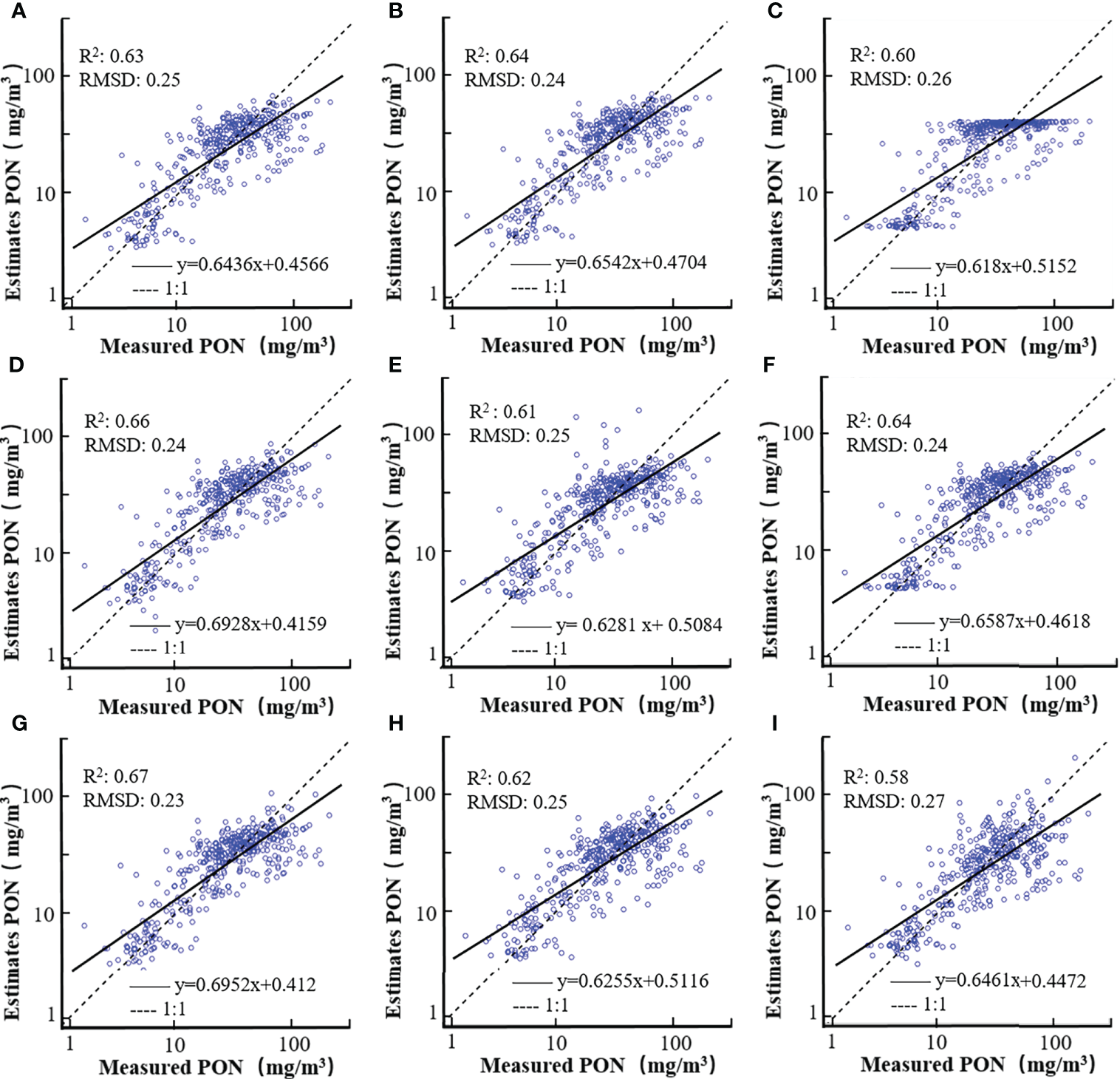 Scatterplots of estimated vs. measured PON concentrations for models based on a(469) (A), a(488) (B), bbp_s(C), BG (D), CI (E), MBR (F), NDNI (G), CHL (H), and POC (I). Both axes are in log10 transformation.