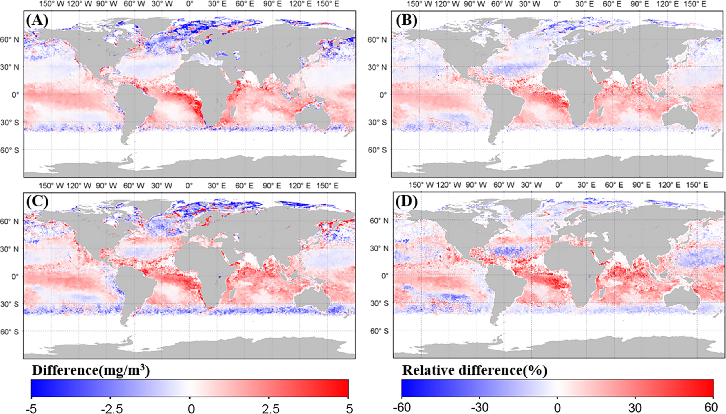 Absolute and relative PON concentration differences between models based on a(488) and the NDNI (A, B), as well as that based on CHL and NDNI (C, D). The left and right columns were for absolute and relative differences, respectively.