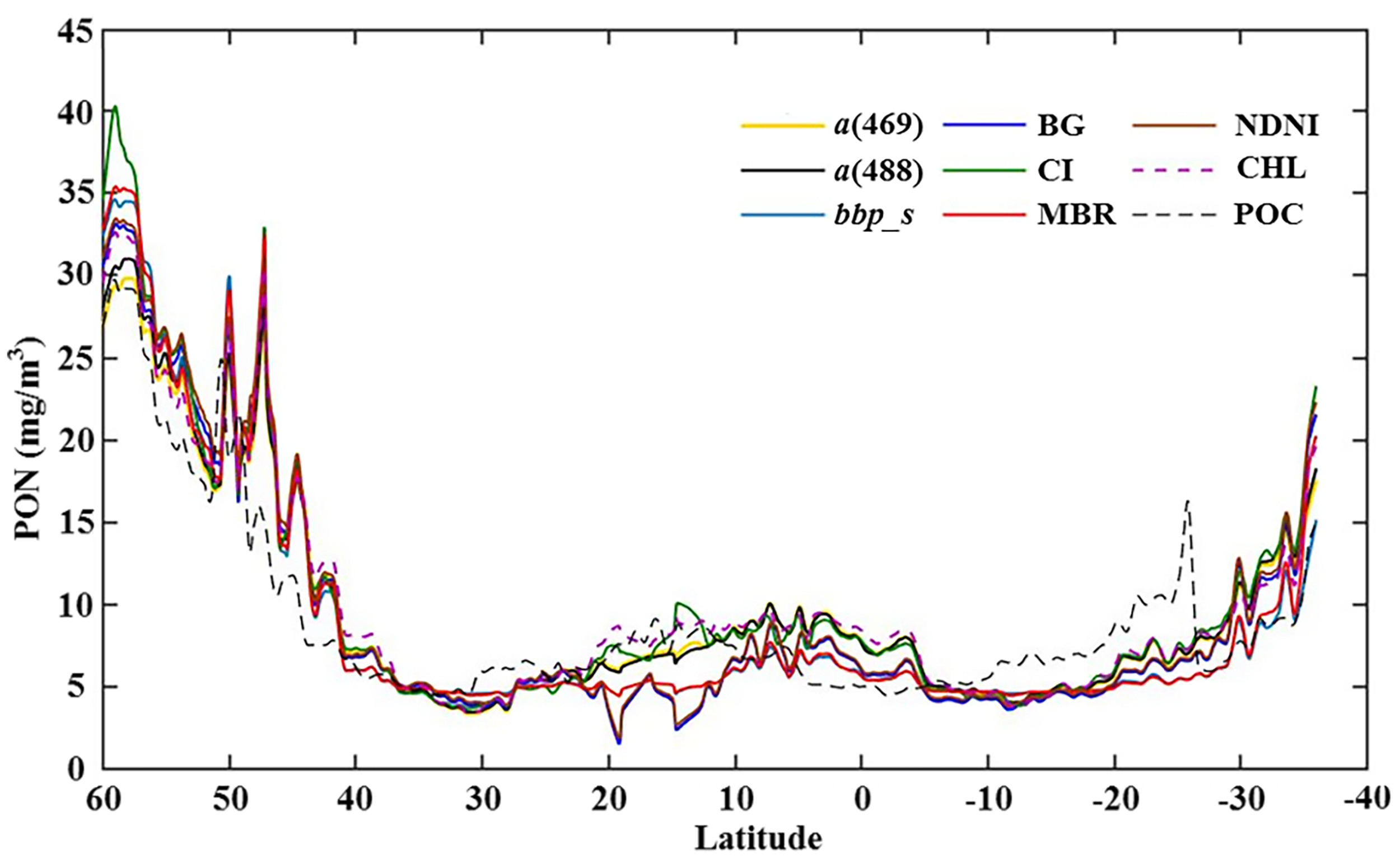 The absolute and relative differences of the a(488)- and CHL-based models against the NDNI-based model are shown in Figure 8, in which absolute differences were calculated in untransformed scale and the relative differences were calculated in log10 transformation. Large relative differences were mainly observed in oligotrophic open oceans and turbid coastal seas. For examples, large positive relative differences were clearly observed in the central Indian Ocean and Coral Sea, while some negative differences were also observed, such as in the Arctic Ocean and Canary Sea (Figure 8). A transect through the Atlantic Ocean at 30°W shows the regional differences in nine model estimates for PON (Figure 9). The relative differences in oligotrophic open oceans were generally small, while larger differences of nine models in the North Atlantic Ocean can be clearly found at about between 40°N and 50°N.