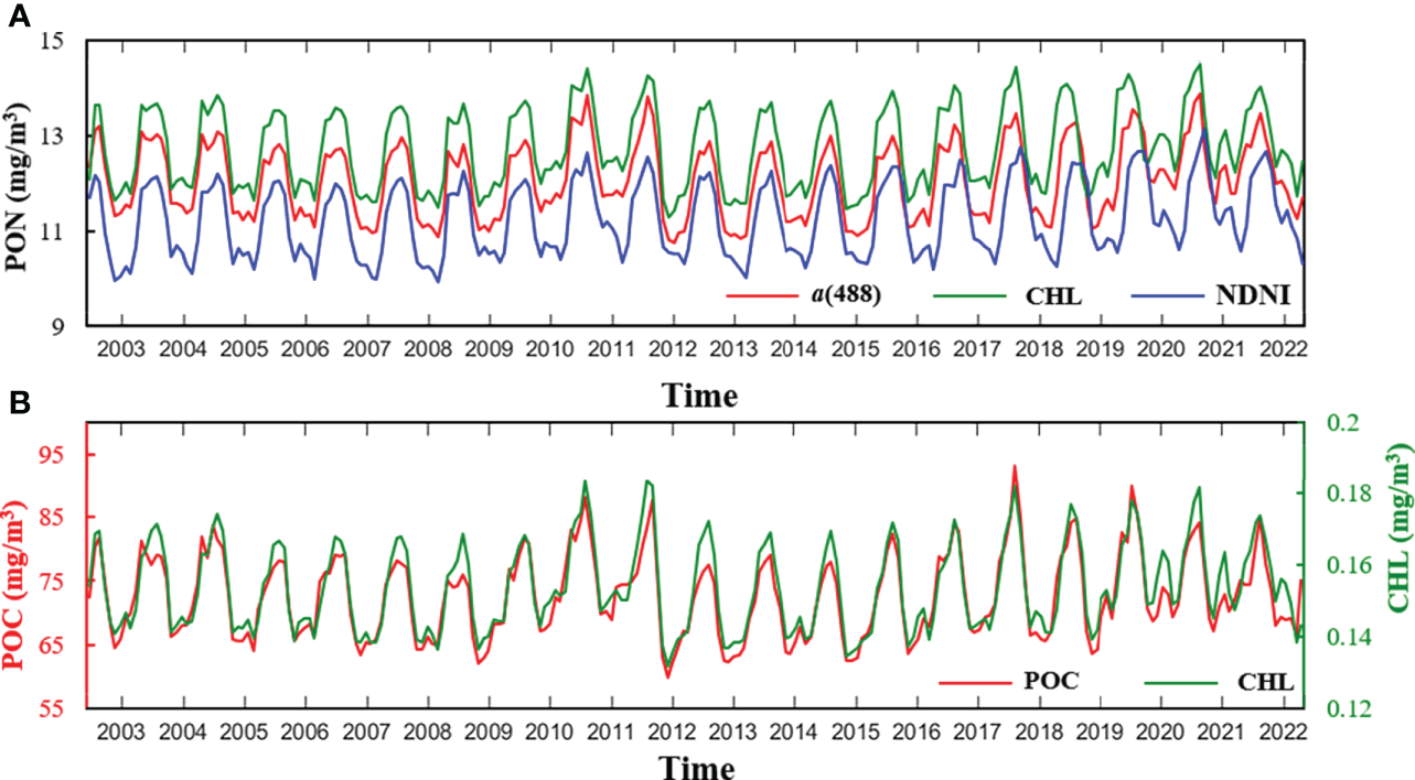 Plot (A) shows the variations of global monthly mean PON concentrations retrieved with the a(488)-, CHL-, and NDNI-based models. Plot (B) shows global monthly mean POC and CHL concentrations.