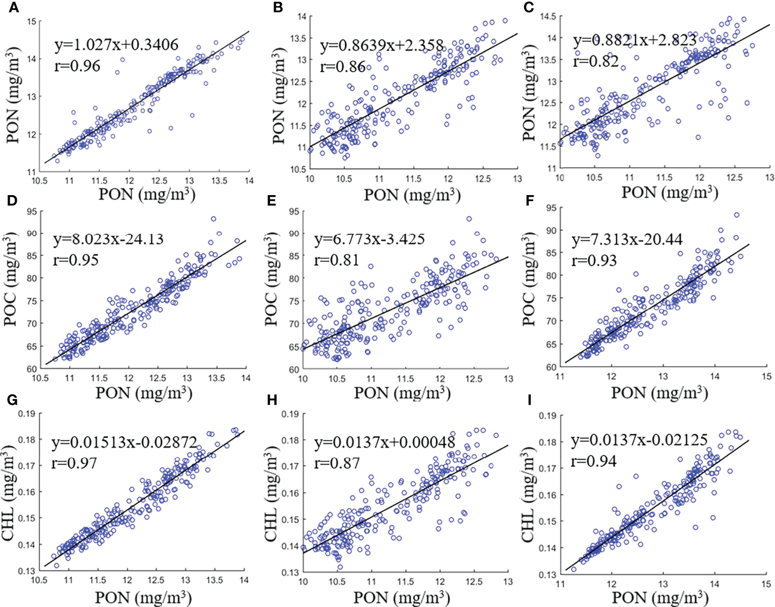 The relationships between the global monthly mean values of PON derived from the three models, POC and CHL were further explored and are illustrated with the scatterplots in Figure 11. All of the nine data pairs had strong correlations with r ≥0.81. The r between PON concentrations derived from a(488)- and CHL-based models was stronger with r = 0.96 than the other two PON data pairs with r = 0.86 and 0.82, respectively, for that of a(488)-based vs. NDNI-based models and CHL-based vs. NDNI-based models (Figures 11A–C). As for the relationships between POC and PON as well as CHL and PON concentrations, satellite-derived POC and CHL concentrations had the highest correlations with PON derived with the a(488)-based model with an r of 0.95 and 0.97, respectively, which is followed by the CHL-based model with r = 0.93 between POC and PON and r = 0.94 between CHL and PON. Both POC and CHL concentrations were derived with blue-to-green band ratio algorithms, and the variations of the blue-to-green band ratio are mainly driven by the total absorption coefficient, especially for chlorophyll-a absorption (Lee et al., 2002). Therefore, satellite-derived POC and CHL concentrations had higher correlations with PON concentrations derived with a(488)- and CHL-based models than the NDNI-based model with r = 0.81 between POC and PON and r = 0.87 between CHL and PON.