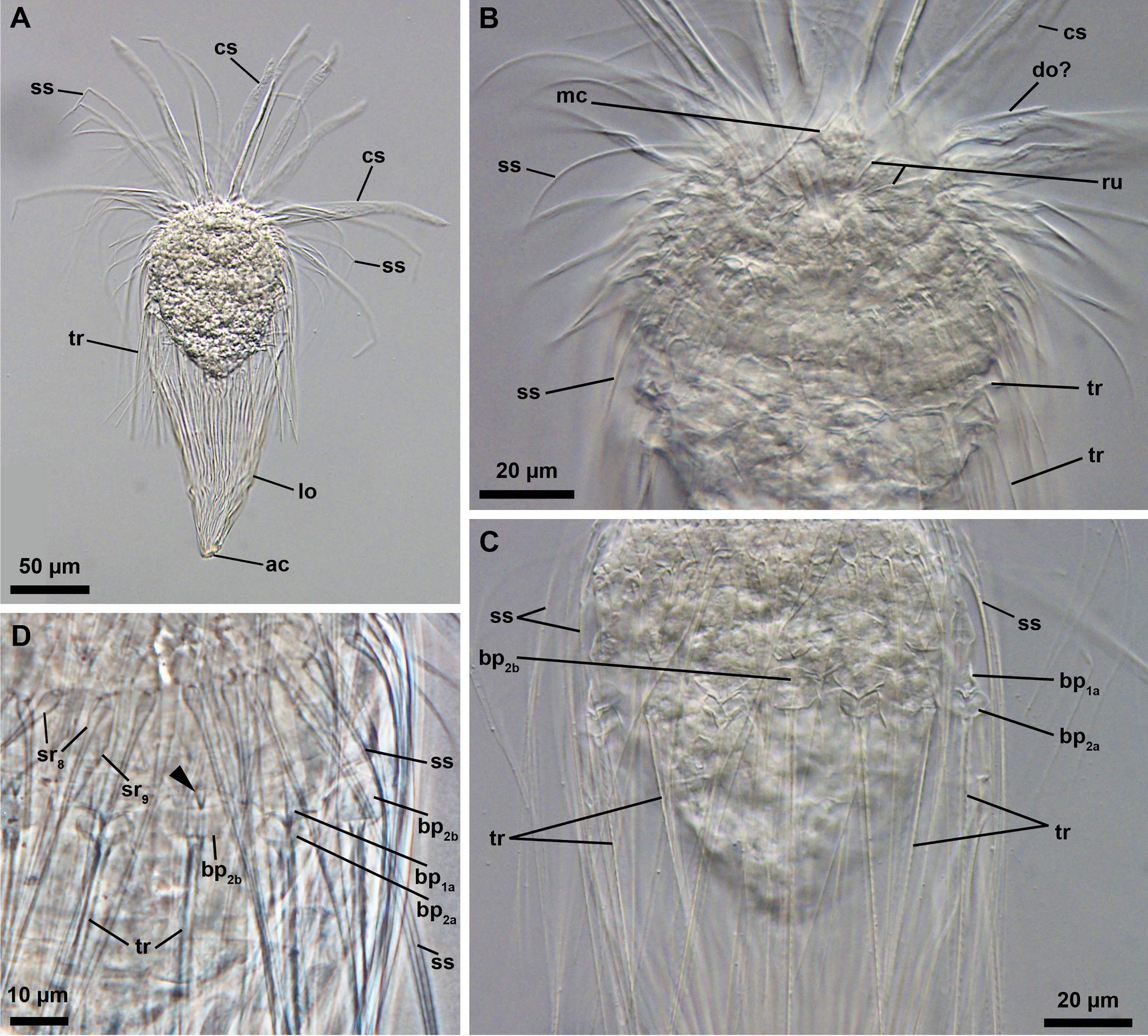 Light micrographs of the adult female of an undescribed species, Rugiloricus sp. 1 (NHMD-621046). (A) Overview of the specimen. Lateral view, anterior faces up. Note that the mouth cone is retracted inside the introvert. (B, C) Anterior region of the body. (D) Close-up of several basal plates of the neck region. Arrowhead points to the medial, posteriorly oriented spike of a basal plate of the anteriormost row. bp1a/b, anterior row basal plates of type a and b; bp2a/b, posterior row basal plates of type a and b; cs, clavoscalids; lo, lorica; mc, mouth cone; sr8,9, spinoscalids of 8th or 9th row; ss spinoscalids; ru, ruff; tr, trichoscalids.