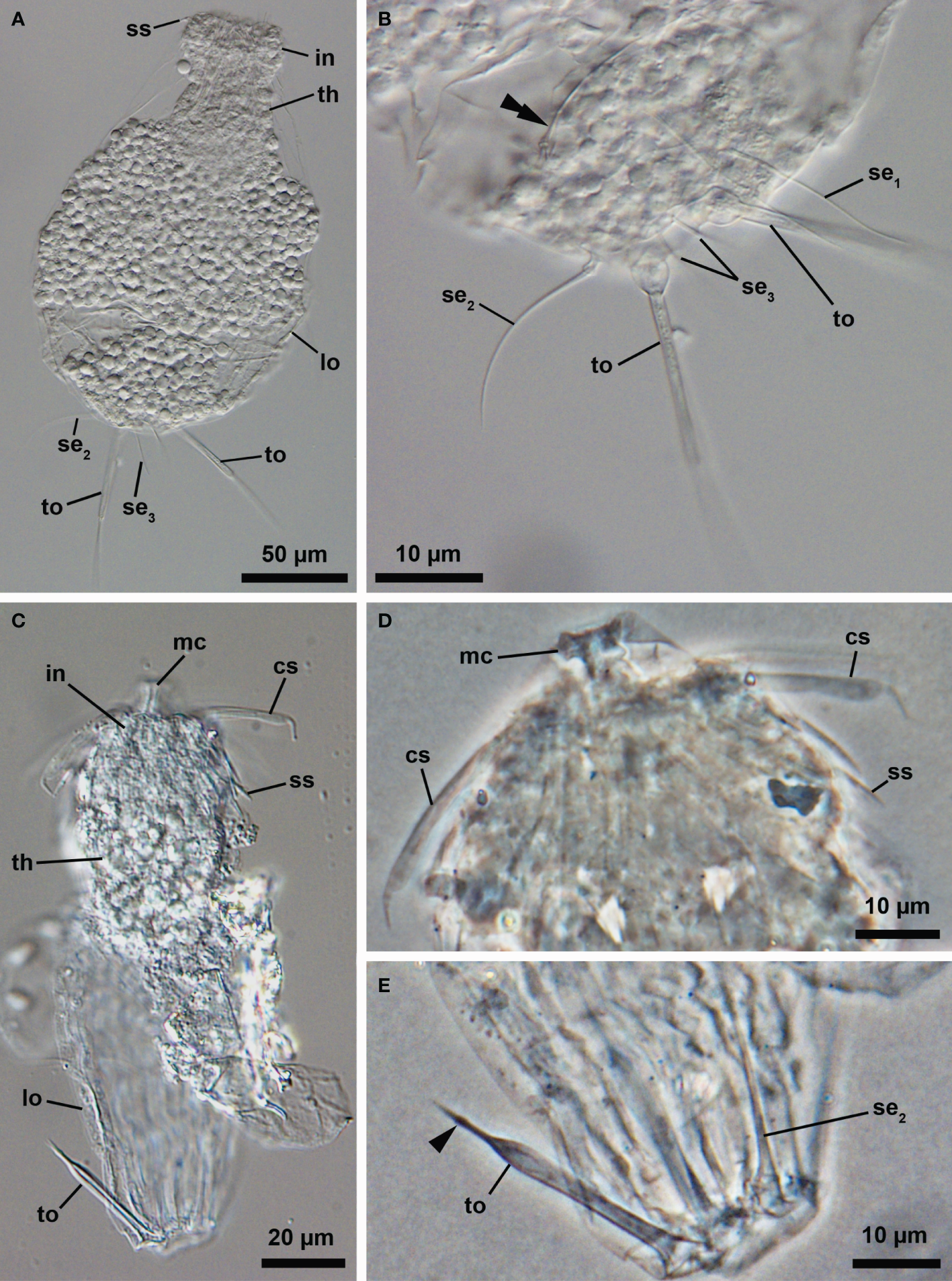 (A, B) Light micrographs of the molting Higgins larva of an undescribed species, Pliciloricus sp. 1 (NHMD-621045) (A) Overview. Ventrolateral view, anterior faces up. (B) Close-up of the posterior region of the body. (C–E) Light micrographs of the Higgins larva of an undescribed genus, (NHMD-621044) (C) Overview. Ventrolateral view, anterior faces up. (D) Close-up of the head. (E) Close-up of the posterior region of the body. Arrowhead points to a small bulge near the distal end of the toe. cs, clavoscalids; in, introvert; lo, lorica; mc, mouth cone; se1, posterodorsal seta; se2, posterolateral seta; se3, posteroterminal seta; ss, spinoscalid; th, thorax; to, toe.