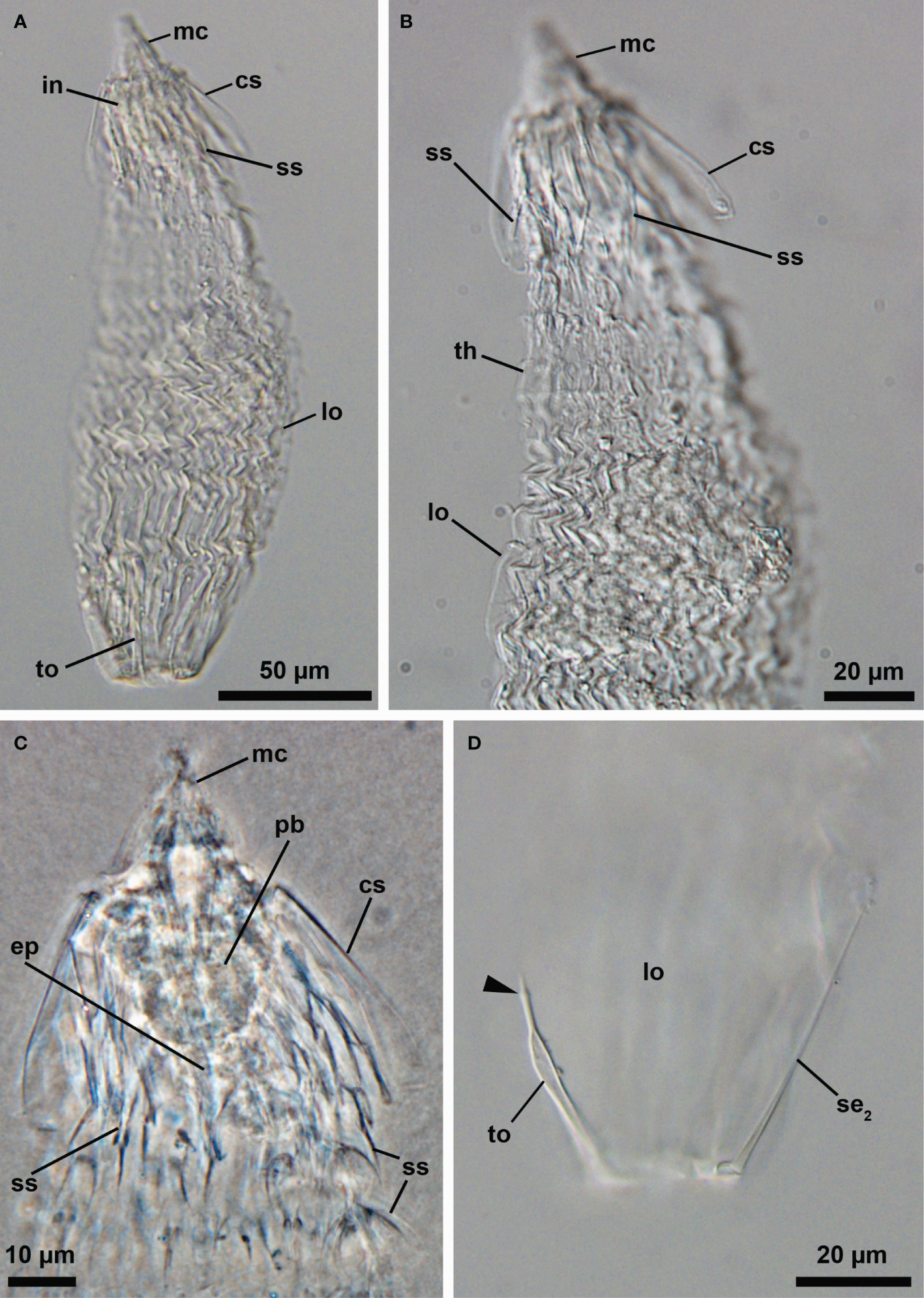 Light micrographs of the Higgins larva of an undescribed genus (NHMD-621043). (A) Overview. Ventral view, anterior faces up. (B) Posterior region of the body. (C) Close-up of the anterior region of the body. (D) Posterior region of the body. Note the small bulge near the distal end of the toe (arrowhead). Abbreviations: cs, clavoscalids; in, introvert; lo, lorica; mc, mouth cone; pb, pharyngeal bulb; se2, posterolateral seta; ss, spinoscalid; th, thorax; to, toe.