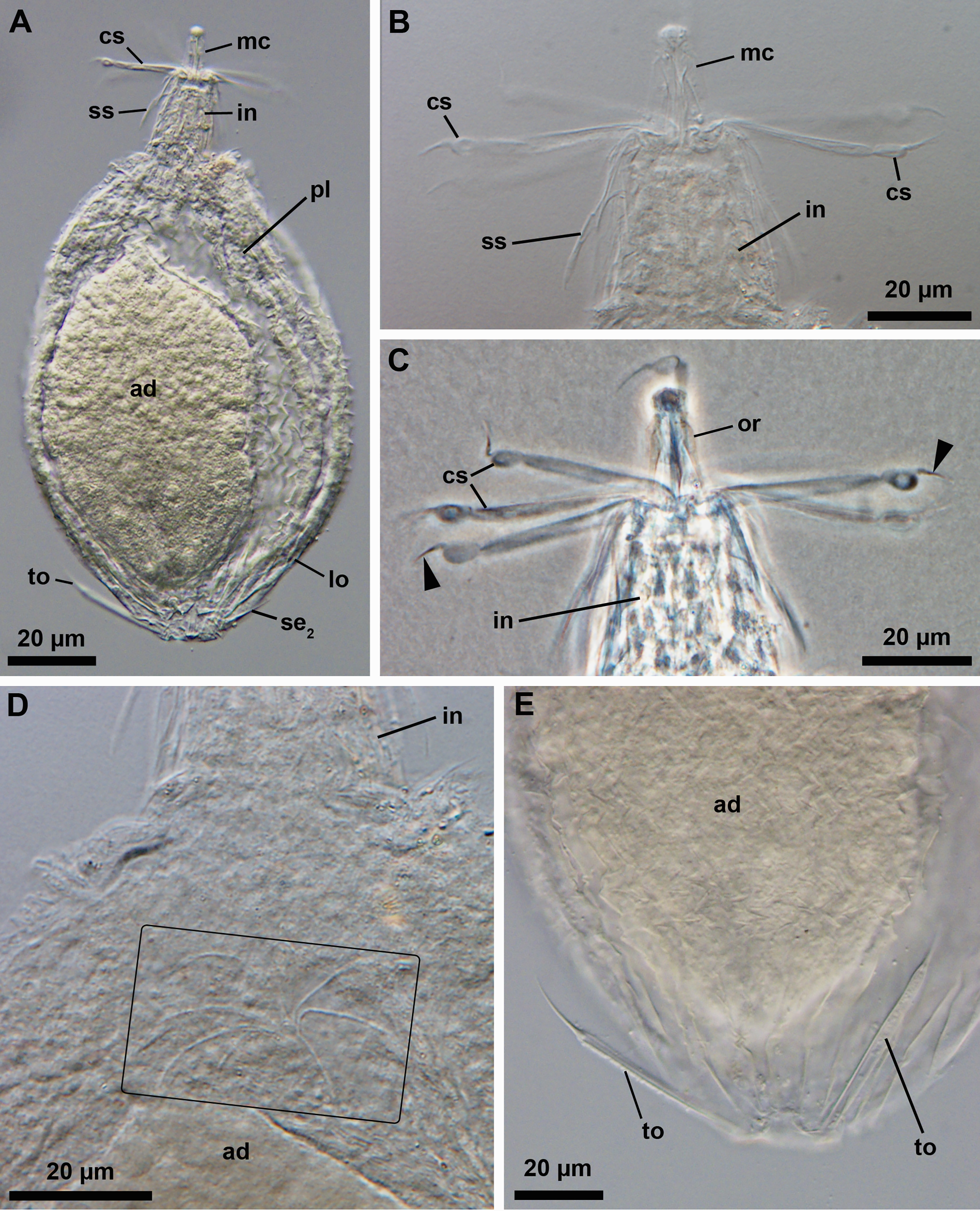 Light micrographs of the last instar Higgins larva (carrying a postlarva and a young adult inside) of an undescribed genus (NHMD-621042). (A) Overview. Ventral view, anterior faces up. (B, C) Anterior region of the body. The arrowhead points to the spine-like distal segment of the three-segmented clavoscalids. (D) Close-up of the abdominal region of the body. The rectangle outlines the ruff of the adult enclosed within the larval and postlarval body. (E) Close-up of the posterior region of the body. Abbreviations: ad, adult; cs, clavoscalids; in, introvert; lo, lorica; mc, mouth cone; or, oral ridge; pl, postlarva; se2, posterolateral seta; ss, spinoscalid; to, toe.