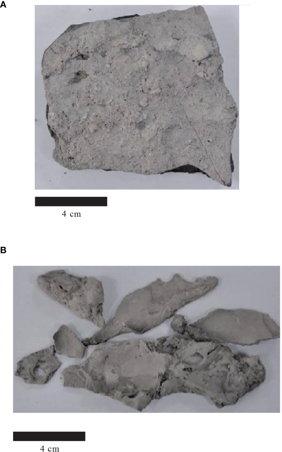Photographs of methane-derived authigenic carbonate (MDAC) from (A) 1.16 mbsf at Site ARA07C-St 13 and (B) 1.10 mbsf at Site ARA07C-St 14.