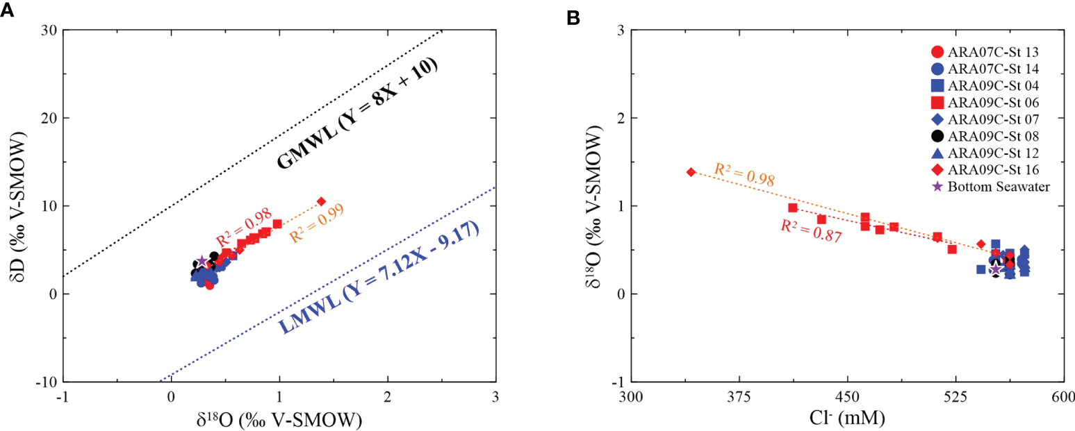 Scatter plots of (A) δD versus δ18O and (B) δ18O versus Cl- in bottom seawater (violet star; Site ARA09C-St 04) and pore fluids from the ARAON Mounds. The GMWL is the global meteoric water line (Craig, 1961), and the LMWL is the local meteoric water line at Inuvik, Canada, by the Global Network of Isotopes in Precipitation (http://www-naweb.iaea.org/napc/ih/IHS_resources_gnip.html). Black color site: reference site without GHs and MDACs, blue color sites: observation of MDACs, and red color sites: observation of GHs and MDACs.
