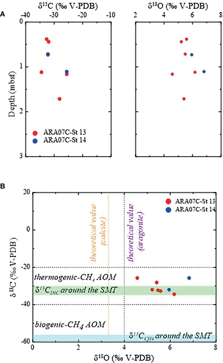 (A) Downcore profiles of δ13C and δ18O in MDACs from the ARAON Mounds. (B) Scatter plots of δ13C versus δ18O in MDACs from the ARAON Mounds. The violet and light orange line are the theoretical δ18Oargonite and δ18Ocalcite estimated by the equation of Kim et al. (2007) and Kim and O’Neil (1997), respectively. The upper and lower black lines are boundaries for MDACs incorporated with thermogenic CH4 and microbial CH4, respectively (Naehr et al., 2007; Crémière et al., 2016; Crémière et al., 2018). The cyan area and light green area are the ranges of δ13CCH4 (Kim et al., 2020) and δ13CDIC (this study) around the SMT, respectively. Red closed circles: MDACs from Site ARA07C-St 13 and blue closed circles: MDACs from Site ARA07C-St 14.