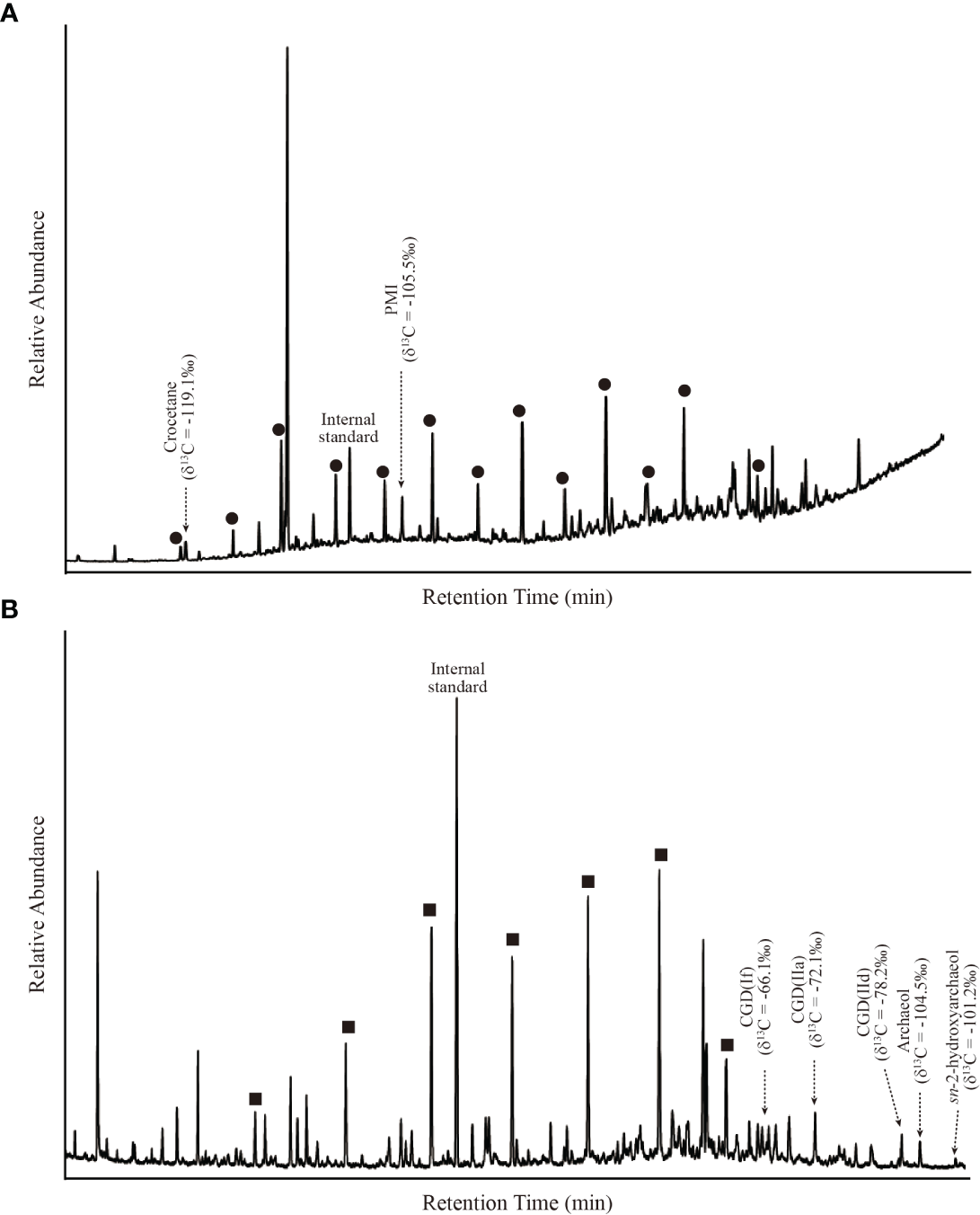 The MDAC sample includes various lipid components of anaerobic methanotrophs, but there is a lack of biomarkers derived from aerobic methanotrophs. Among the apolar components, the irregular, tail-to-tail linked isoprenoid acyclic C20 (2, 6, 11, 15-tetramethylhexadecane or crocetane) and C25 (2, 6, 10, 15, 19-pentame-thylicosane, PM) hydrocarbons are present in the MDAC sample. The δ13C values of the isoprenoid hydrocarbons (i.e., crocetane, PMI) are -119.1‰ and -105.5‰, respectively (Figure 6). Similarly, the isoprenoid glycerol diethers archaeol and sn-2-hydroxyarchaeol are detected in the polar fractions of MDAC samples with δ13C values of -104.5‰ to -101.2‰. Another distinct group of detected compounds is non-isoprenoid glycerol diethers (DGDs), tentatively inferred previously as a marker of uncharacterized sulfate reducing bacteria (Werne et al., 2002; Pancost et al., 2011). These compounds (e.g., DGD (If), DGD (IIa), and DGD (IId)) have low δ13C values in the range of -78.2‰ to -66.1‰ (Figure 6).