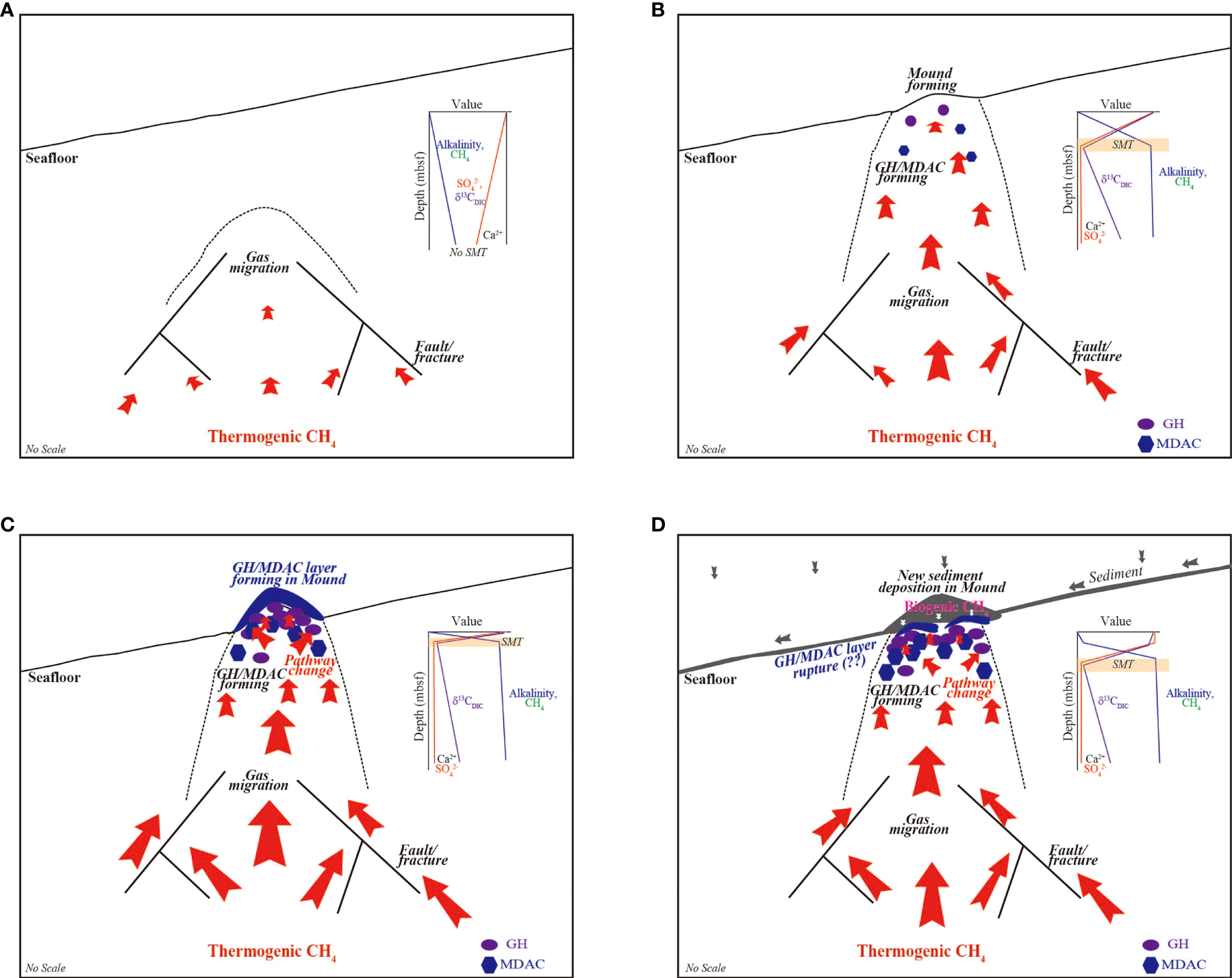 (A) Downcore profiles of Cl-, alkalinity, Na+, Mg2+, K+, Ca2+, Sr2+, and H4SiO4 in pore fluids from the ARAON Mounds. (B) Downcore profile of SO42- in pore fluids from the reference site, non-GH bearing sites, and GH bearing sites in the ARAON Mounds. (C) Downcore profiles of δ18O, δD, δ13CDIC, and 87Sr/86Sr in pore fluids from the ARAON Mounds. Black color site: reference site without GHs and MDCAs, blue color sites: observation of MDACs, and red color sites: observation of GHs and MDACs.