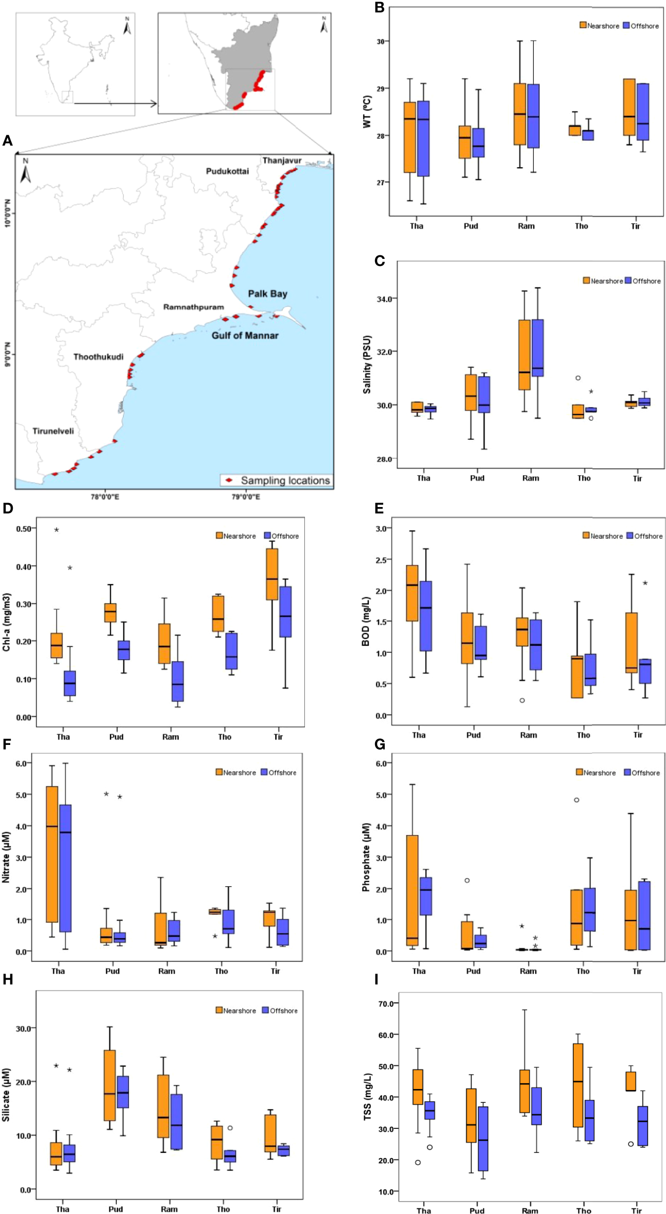 Study area map and box-whisker plots display variations for selected physiochemical variables. (A) sampling locations, (B) WT, (C) salinity, (D) chl-a, (E) BOD, (F) nitrate, (G) phosphate, (H) silicate and (I) TSS. In each plot, the median is represented by the central point, the interval is represented by the rectangle (i.e. 25% and 75% percentiles), and range indicated by the whisker [(*: extreme outlier;◦: mild outlier); Sampling locations: THA, Thanjavur; PUD, Pudukottai; RAM, Ramanathapuram; THO, Thoothukudi; and TIR, Tirunelveli.