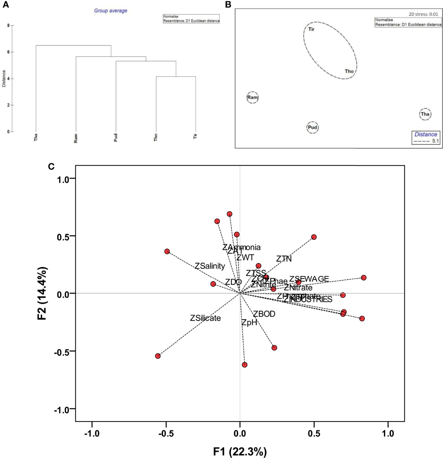 The cluster analysis generated a dendrogram with only one cluster containing THO & TIR which might be explained by the similarity in average values of physicochemical characteristics and dissimilarity from the other locations. The other locations i.e. THA, PUD and RAM were outliers Figure 2A. The PUD and RAM, however, showed closed distance on the dendrogram with the cluster formed between THO & TIR. On the other hand, THA showed maximum distance from the cluster resulting from the significant differences in physicochemical values at this location when compared to the other locations. The distance between PUD and RAM was very less which could be attributed to the similar values of silicate compared to other locations. The physiochemical variables depicted a comparable pattern to that of cluster analysis while exposed to 2D nMDS analysis (Figure 2B).