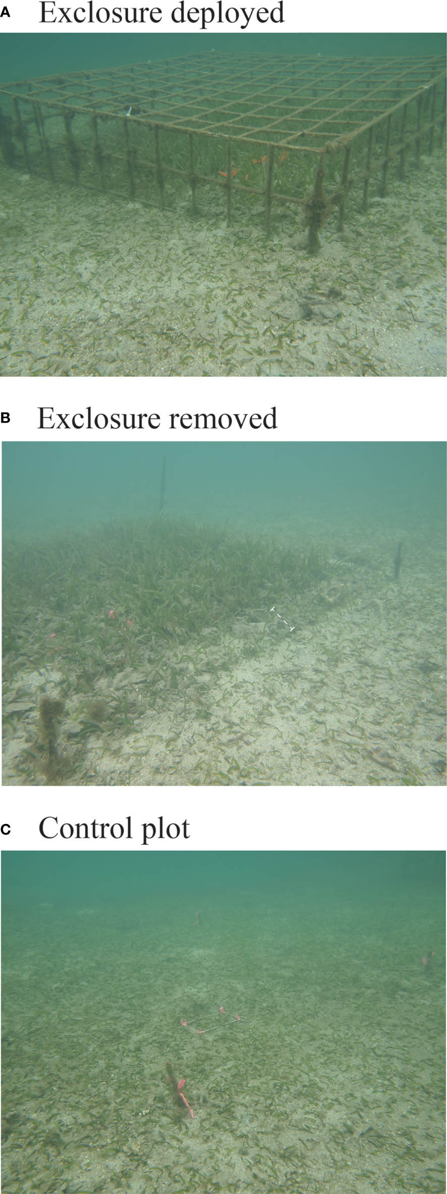 Five exclosures and five control plots were haphazardly deployed at the study site on September 1st 2018 and removed on October 3rd 2019, for a total of 13 months deployed in the field. Megaherbivore exclosures were assembled in the field and composed of commercially available electro-welded mesh made of steel rods (5 mm diameter) with 15 cm square openings (Figure 1). Exclosure opening size was aimed at protecting seagrass from grazing by megaherbivores such as fish > 15 cm, sea turtles, and manatees, while smaller herbivores such as small invertebrates, urchins and fish < 15 cm were not excluded. Exclosure tops consisted of square 1.5 x 1.5 m panels. The exclosure sides consisted of rectangular panels 1.5 m in length by 30 cm in height above the sediment and 15 cm pins left at the bottom of each side panel and inserted into the sediment. At each of the corners of the exclosure a rebar rod (50 cm length and 10 mm diameter) was inserted ~ 15 cm into the sediment to support the exclosure and aid anchoring it to the sediment. The panels were attached to each other and to the support rods using plastic zip ties. Control plots consisted only of the rebar rods at the four corners marking an area with the same dimensions as the exclosures. Each exclosure and control were marked with numbered plastic identification tags.