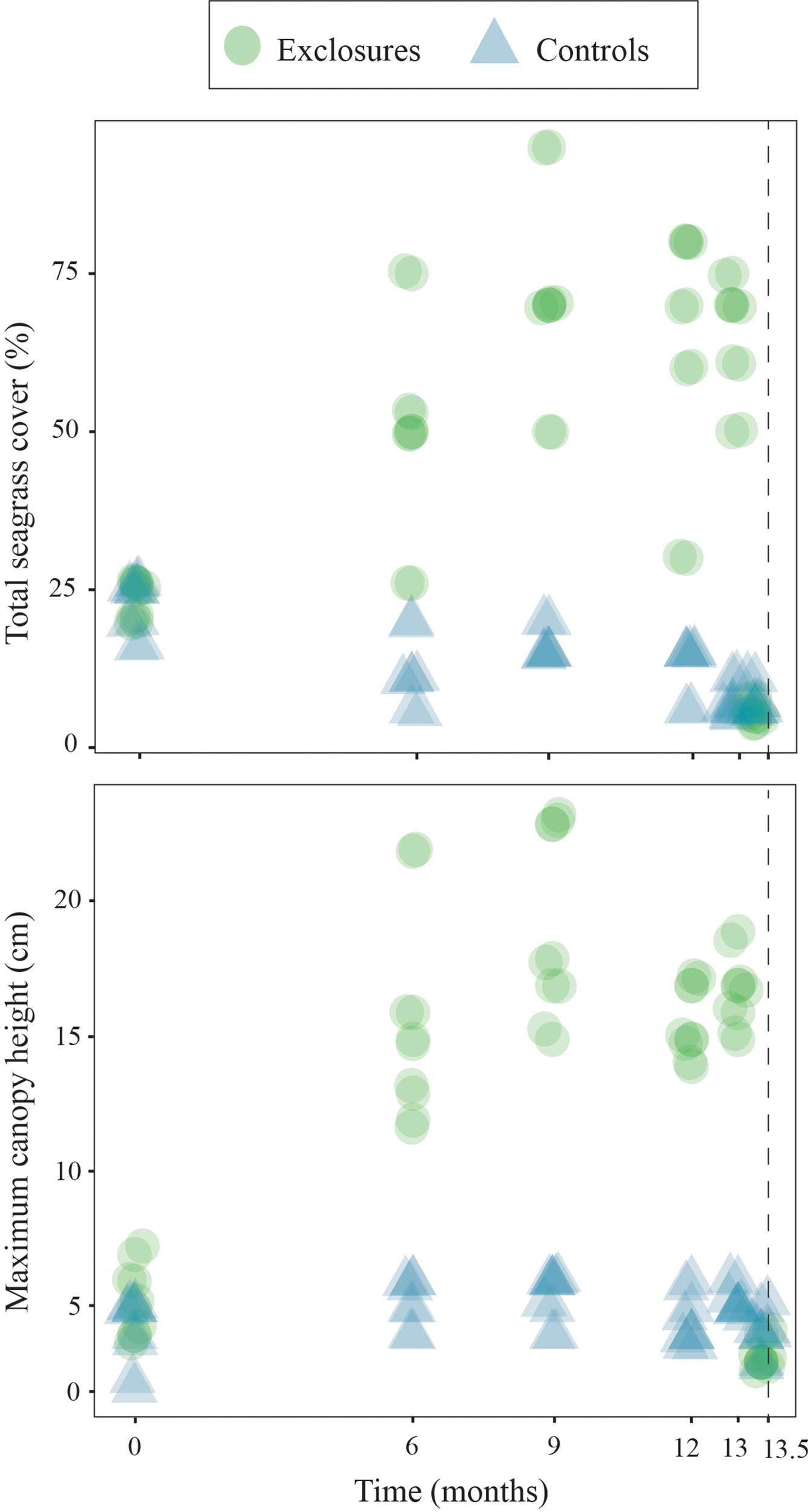 Total seagrass cover and maximum canopy height within exclosures and controls over 13 months of megaherbivore exclusion at Cahuita, southern Caribbean coast of Costa Rica. The dotted line marks an additional sampling two weeks after exclosures were removed. Results have been jittered for visualization purposes.