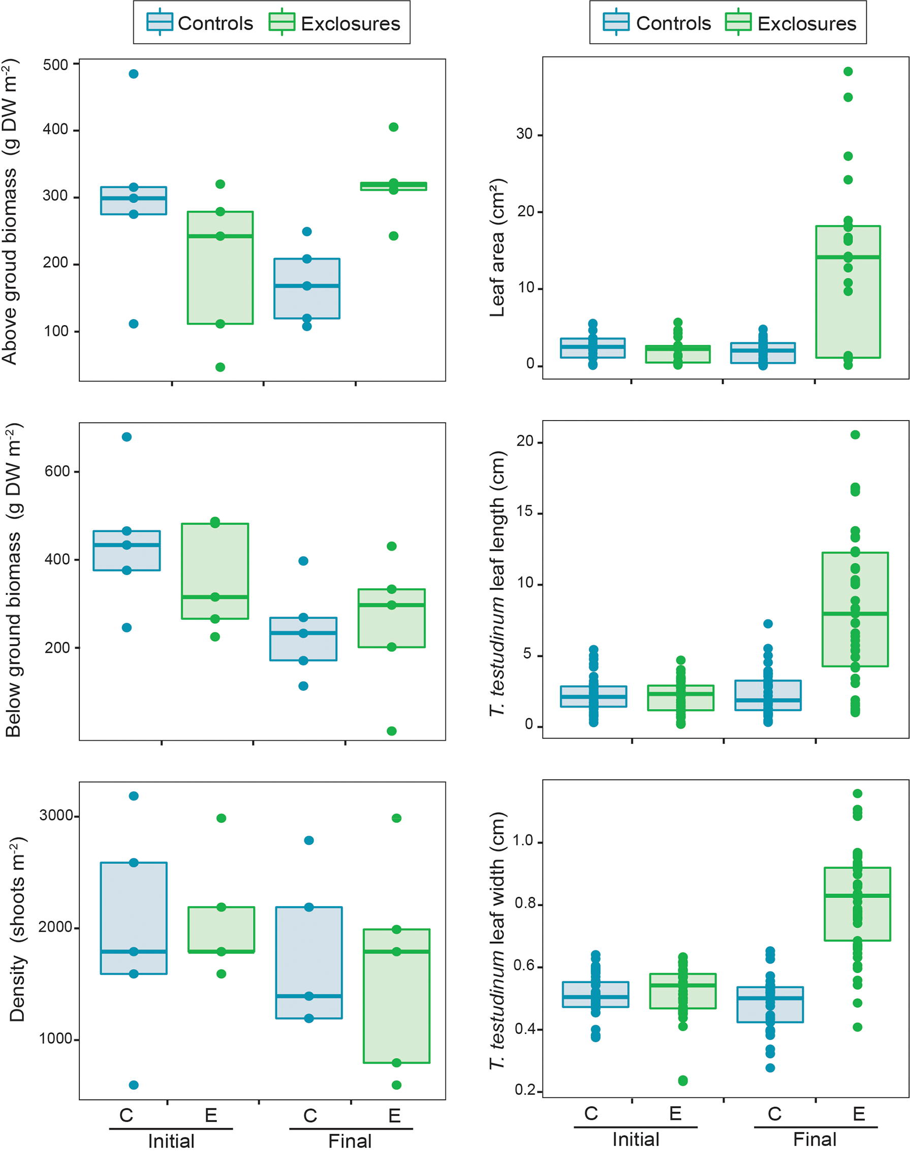 Seagrass above and below ground biomass, density, leaf area and Thalassia testudinum leaf length and width within controls and exclosures at the start and end of 13 months of megaherbivore exclusion at Cahuita, southern Caribbean coast of Costa Rica.