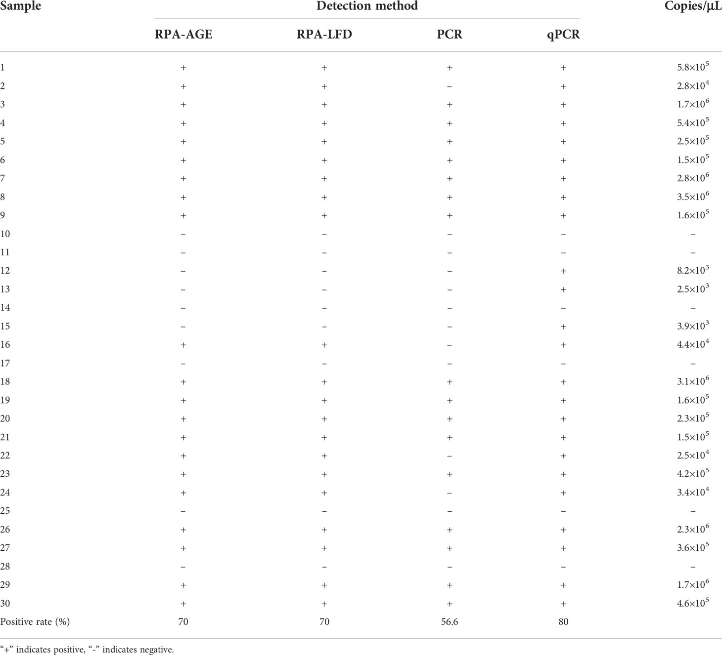 Thirty shrimp samples from three farms were analyzed by RPA-AGE, RPA-LFD, PCR, and qPCR. The positive rate of RPA-AGE and RPA-LFD (21/30, 70.0% for both) was lower than that of qPCR (24/30, 80.0%), but higher than that of PCR (17/30, 56.7%) (Table 3).