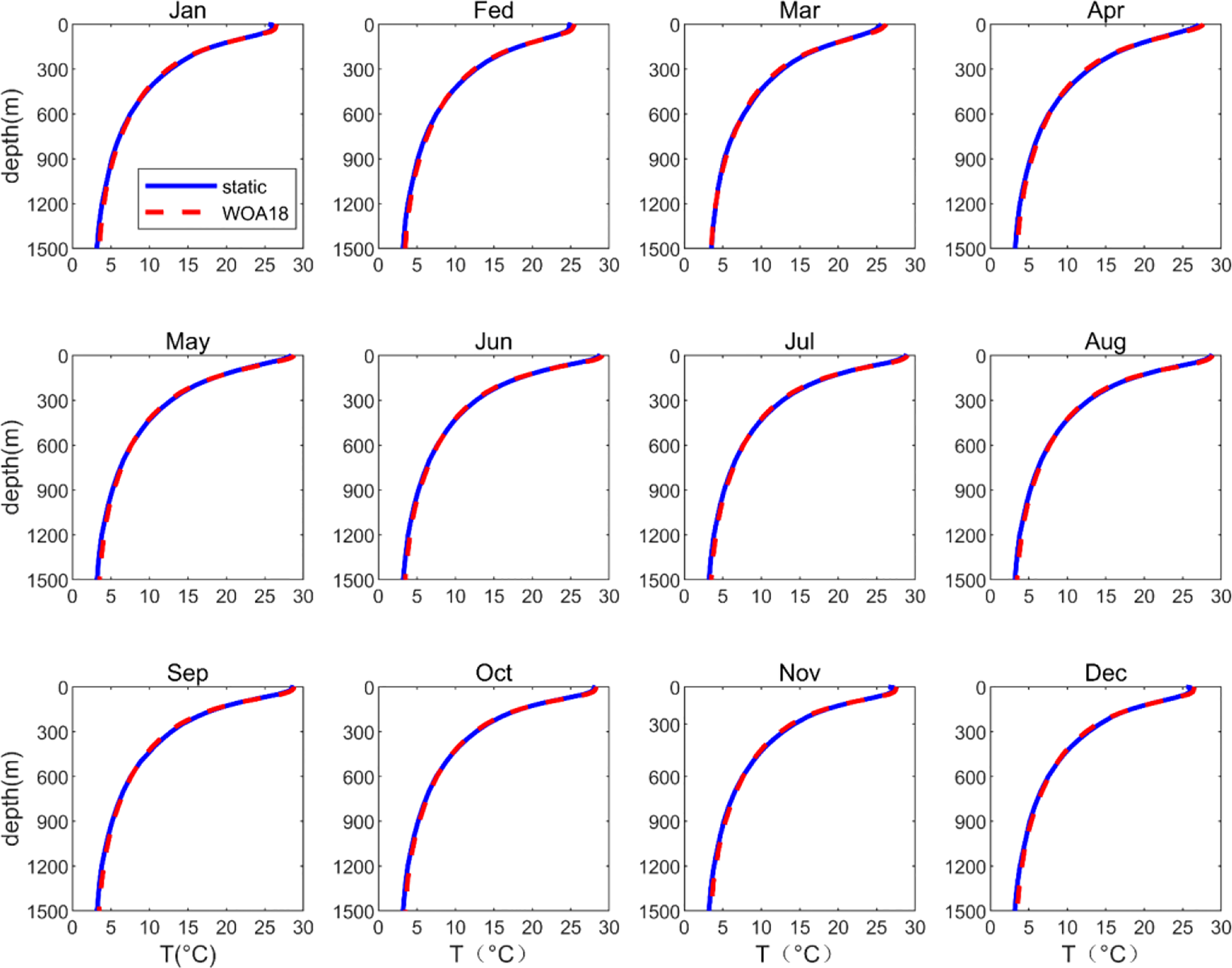 Monthly temperature profiles in the northern South China Sea. The blue and red lines represent the static climatic field and the WOA18 data, respectively.