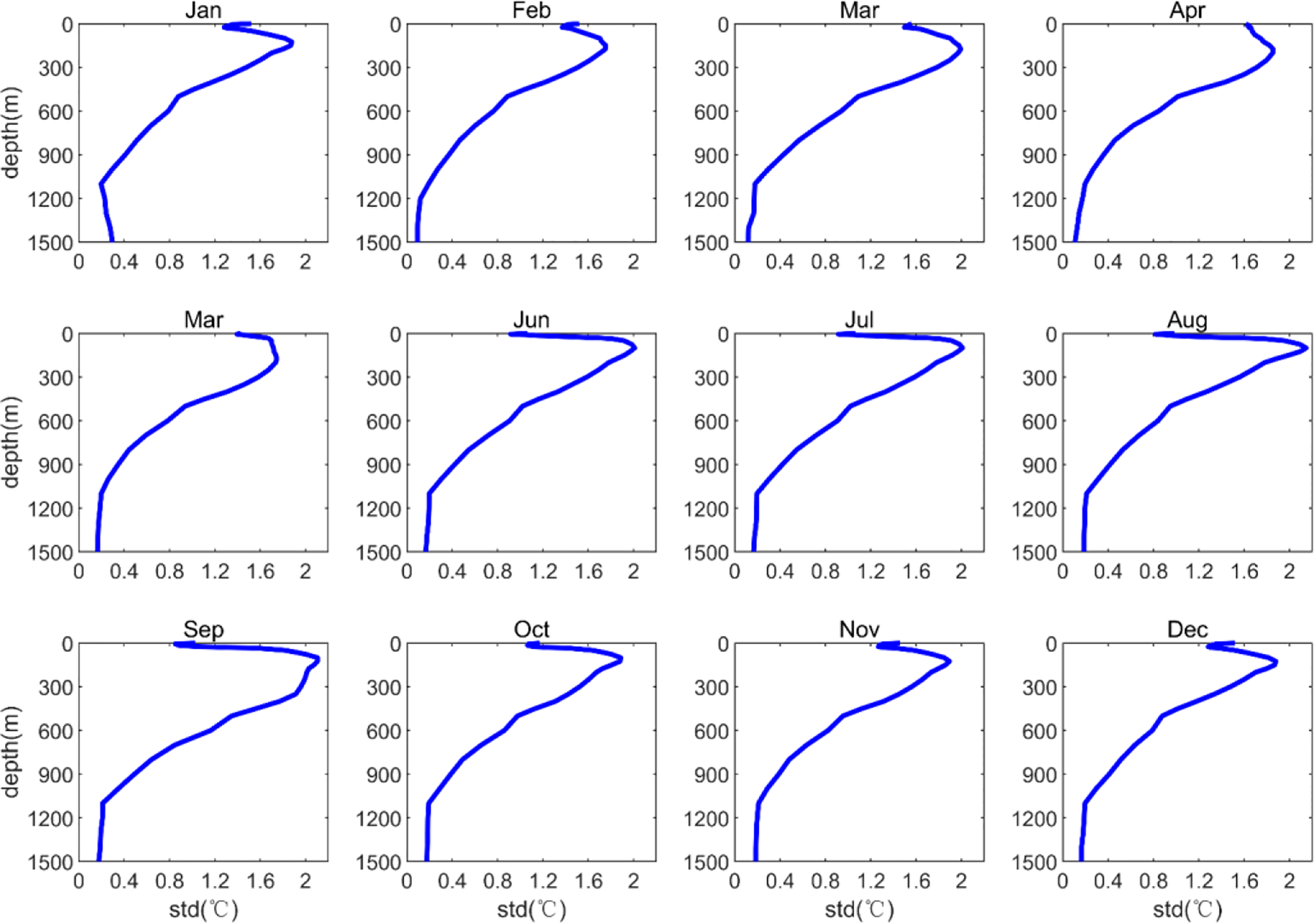 Vertical distribution of monthly static climatic temperature field standard deviations in the northern South China Sea.