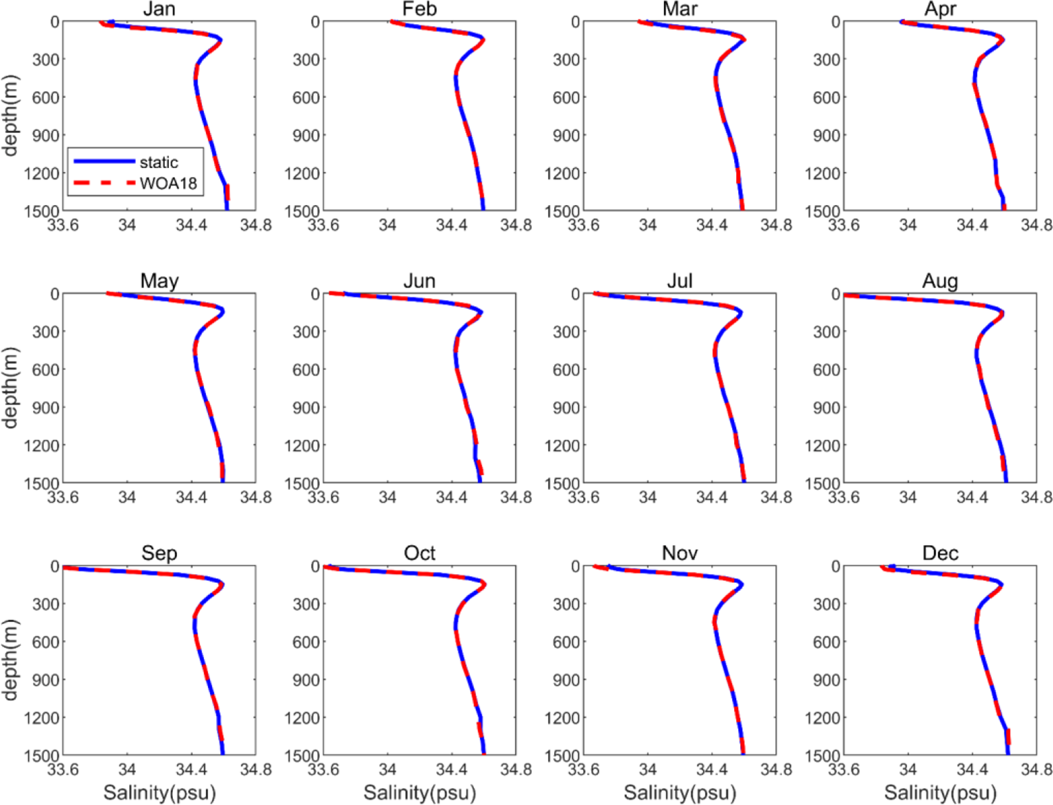 Monthly salinity profiles in the northern South China Sea. The blue and red lines represent the static climatic field and WOA18 data, respectively.