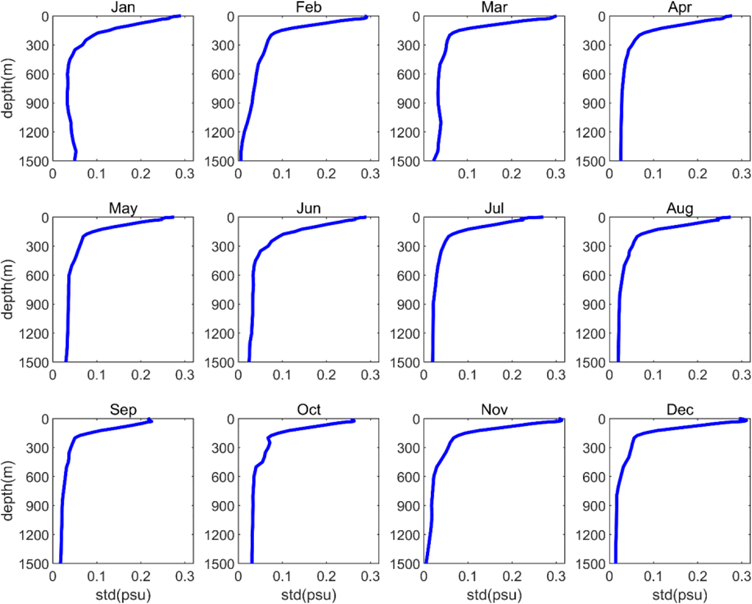 Vertical distribution of monthly static climatic salinity field standard deviations in the northern South China Sea.