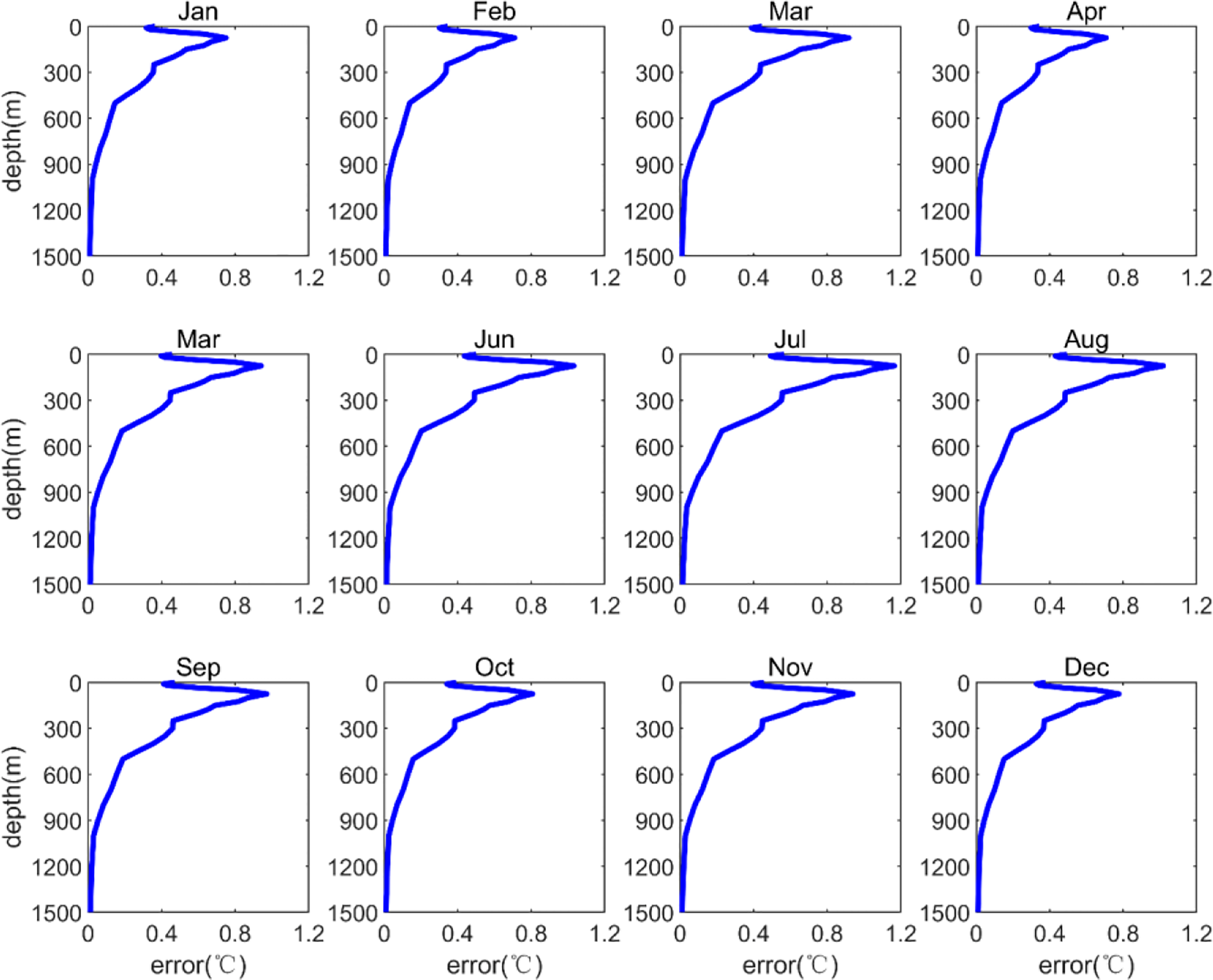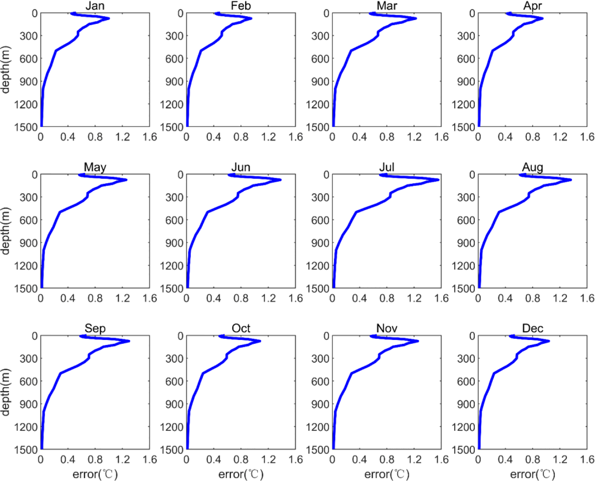 Vertical distribution of expanded temperature field monthly errors in the northern South China Sea (cross-validation tests).