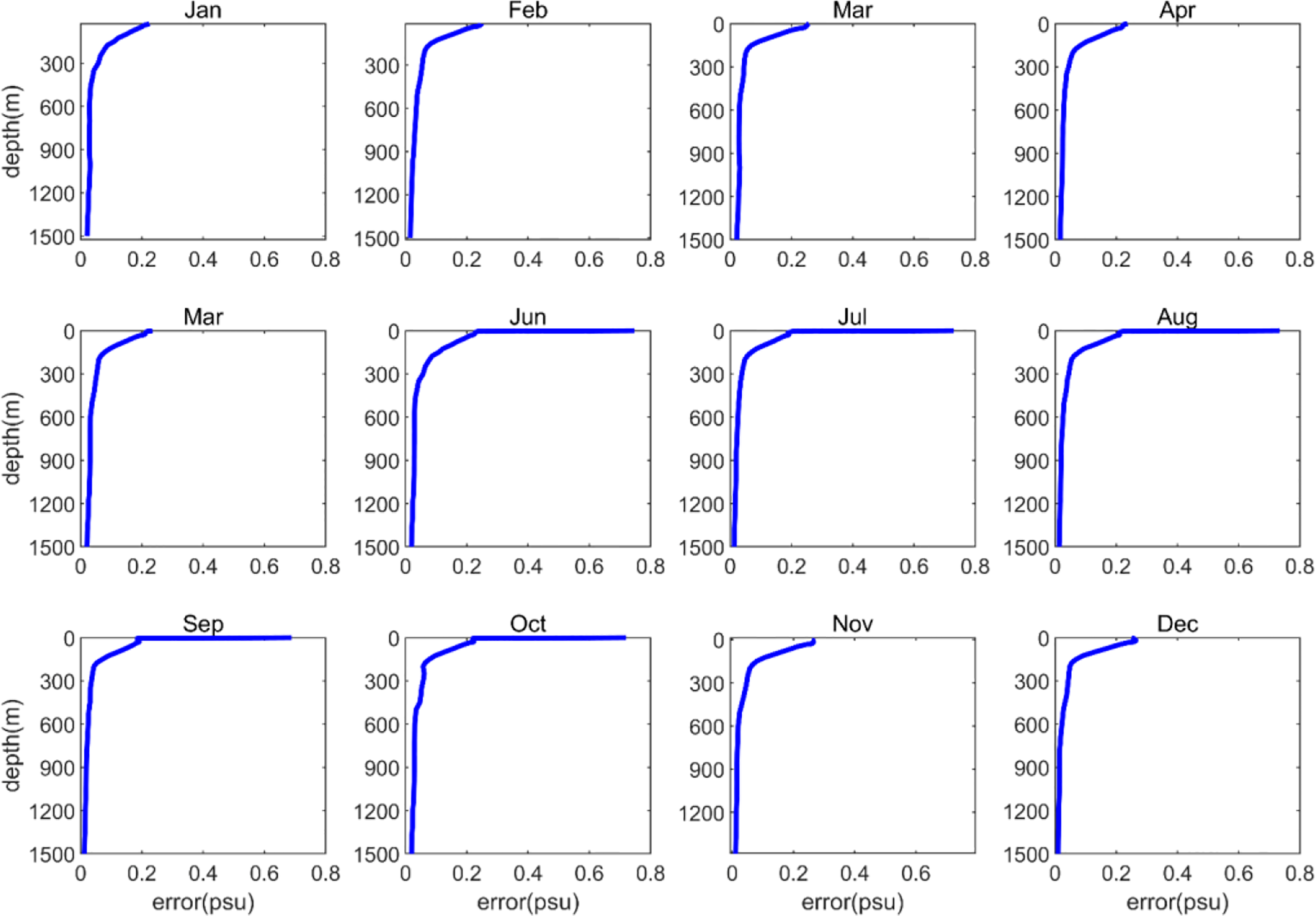 Vertical distribution of expanded salinity field monthly errors in the northern South China Sea (cross-validation tests).