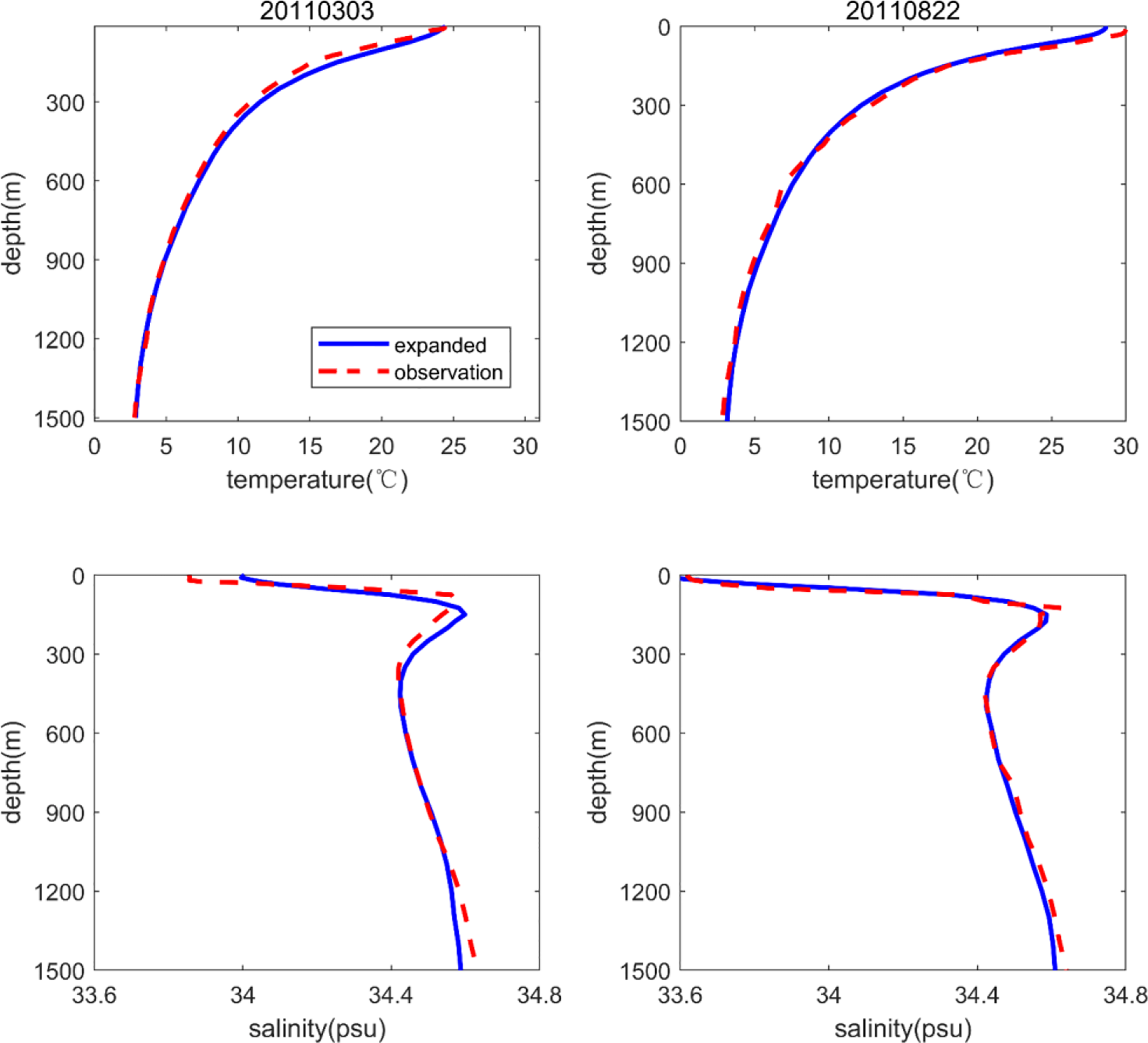 Stations 20110303 and 20110822 in Figure 8 were selected for further study. The expanded T–S profiles are compared with the observed data in Figure 9. The results show that the expanded profiles are very close to the observed profiles, proving that the expanded field can be effectively applied in this region. Furthermore, the spatial distribution of maximum temperature errors along the vertical showed in Figure 8, which revealed that the maximum errors increase near the coast of South China Sea.